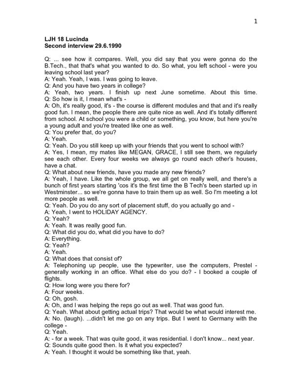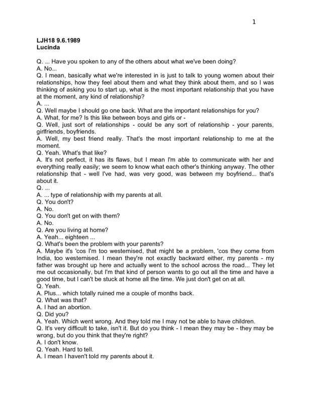 LJH18 9.6.1989 Lucinda Q. ... Have you spoken to any of the others about what we've been doing? A. No... Q. I mean, basically what we're interested in is just to talk to young women about their relationships, how they feel about them and what they think about them, and so I was thinking of asking you to start up, what is the most important relationship that you have at the moment, any kind of relationship? A. ... Q. Well maybe I should go one back. What are the important relationships for you? A. What, for me? Is this like between boys and girls or Q. Well, just sort of relationships - could be any sort of relationship - your parents, girlfriends, boyfriends. A. Well, my best friend really. That's the most important relationship to me at the moment. Q. Yeah. What's that like? A. It's not perfect, it has its flaws, but I mean I'm able to communicate with her and everything really easily; we seem to know what each other's thinking anyway. The other relationship that - well I've had, was very good, was between my boyfriend... that's about it. Q. ... A. ... type of relationship with my parents at all. Q. You don't? A. No. Q. You don't get on with them? A. No. Q. Are you living at home? A. Yeah... eighteen ... Q. What's been the problem with your parents? A. Maybe it's 'cos I'm too westernised, that might be a problem, 'cos they come from India, too westernised. I mean they're not exactly backward either, my parents - my father was brought up here and actually went to the school across the road... They let me out occasionally, but I'm that kind of person wants to go out all the time and have a good time, but I can't be stuck at home all the time. We just don't get on at all. Q. Yeah. A. Plus... which totally ruined me a couple of months back. Q. What was that? A. I had an abortion. Q. Did you? A. Yeah. Which went wrong. And they told me I may not be able to have children. Q. It's very difficult to take, isn't it. But do you think - I mean they may be - they may be wrong, but do you think that they're right? A. I don't know. Q. Yeah. Hard to tell. A. I mean I haven't told my parents about it. 2 Q. At all? A. No. They've got no idea at all... That's how my friend actually helped me a lot, 'cos she helped me through it. Q. Have you spoken to anybody else about it, did you find it difficult to A. I don't find it difficult now 'cos I've kind of come to terms with it now, but before, at the time, you know, when I was pregnant I was like crying all the time. And now if I look at small children, I always think oh no, you know. Q. Well it's very recent isn't it, I mean A. Yeah. Q. What about - what happened with the boyfriend then, I mean was that A. He never found out, he never knew at all. Q. You didn't tell him? A. Well actually I did tell him afterwards, about three months after I told him, he was pretty hurt that I hadn't told him at the time, but I said I thought it was my own, my own thing to do, and it's my decision, and like I've been thinking now if it was - if he had something to do with it. Q. What... Was, I mean how was the relationship at the time that you became pregnant, I mean was it okay, or A. Well it was a very sudden thing anyway, we weren't thinking about actually having a relationship like that, we just got carried away one night, I found out I was pregnant, by then we'd split up. Q. How did you feel about splitting up with him, I mean A. Well, I - at the time we split up I didn't know I was pregnant, and I was pretty happy about it. Q. Yeah. You weren't too keen on him then – well, it's a difficult situation isn't it, I mean A. But, I don't know, we're sort of mates now. Q. Yeah. Was that the boyfriend that you'd had a sexual relationship with? A. Yeah. Q. And you just got carried away one night A. Mm. And I regret it all. Q. Yeah? Who was he, was he somebody that you knew as a friend before? A. Yeah, someone I knew as a friend, yeah. Q. Yeah... A difficult sort of thing to ... isn't it? Well I hope it's gonna be okay, I mean it would be good to speak to - I mean are there any people here at the school, counsellors, people you could talk to about it? A. No... Q. Yeah. Well it's as well not to sort of bottle it up yourself, to find somebody you can talk to - I suppose that's where your girlfriend comes in A. Yeah. She comes - I talk to her about it - I don't know, I find that I can relax after talking about it. But sometimes I feel that it's something that I just have to sort out on my own. Q. Mm, yeah. A. ... It actually helps to - it sounds stupid, it's just a place, but it's my place, it's where I go to sort out my problems. Q. Where's that? A. I don't know - just up there - 3 Q. ... Heath. A. Yeah. But I sit up there on the hill and I get really relaxed and I sort out my problems. I don't know why, it's only a stupid place, but I do. Q. No, that's quite nice, I mean I like the idea of - it's like nature or something, there's nothing else around. Yeah. Well I hope that's gonna work out, I mean it's hard to know at this point, probably later on... feel better, or what the situation is, I mean actually having children - had you planned to have children or...? A. I've always thought that I'd like to have children. Q. Mm. A. Can we change the subject please? Q. Yeah, certainly. Well let me ask you about AIDS. A lot easier. One of the things that we're interested in is finding out what young people know about AIDS and how they feel about it. How - has it affected you at all, have you thought about it? A. No, I've just thought ... use a condom, make sure he uses a condom. And - well I'm aware of it but - there - I don't know that much about it, just that if you sleep around a lot you have the risk of - not if you sleep around, if you don't use anything, you may be risking yourself. Q. Where did you first hear about it, can you remember? A. Oh, I don't know, there was a week of it when the TV, news, everything was talking about it Q. Yeah. A. - but now it's gradually got slower, n