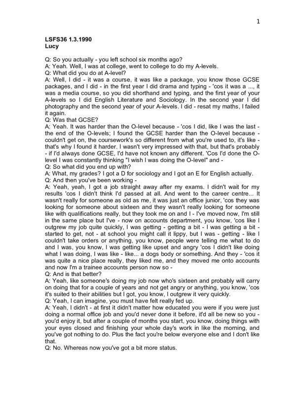 LSFS36 1.3.1990 Lucy Q: So you actually - you left school six months ago? A: Yeah. Well, I was at college, went to college to do my A-levels. Q: What did you do at A-level? A: Well, I did - it was a course, it was like a package, you know those GCSE packages, and I did - in the first year I did drama and typing - 'cos it was a ..., it was a media course, so you did shorthand and typing, and the first year of your A-levels so I did English Literature and Sociology. In the second year I did photography and the second year of your A-levels. I did - resat my maths, I failed it again. Q: Was that GCSE? A: Yeah. It was harder than the O-level because - 'cos I did, like I was the last the end of the O-levels; I found the GCSE harder than the O-level because couldn't get on, the coursework's so different from what you're used to, it's like that's why I found it harder. I wasn't very impressed with that, but that's probably - if I'd always done GCSE, I'd have not known any different. 'Cos I'd done the Olevel I was constantly thinking "I wish I was doing the O-level" and Q: So what did you end up with? A: What, my grades? I got a D for sociology and I got an E for English actually. Q: And then you've been working A: Yeah, yeah, I got a job straight away after my exams. I didn't wait for my results 'cos I didn't think I'd passed at all. And went to the career centre... It wasn't really for someone as old as me, it was just an office junior, 'cos they was looking for someone about sixteen and they wasn't really looking for someone like with qualifications really, but they took me on and I - I've moved now, I'm still in the same place but I've - now on accounts department, you know, 'cos like I outgrew my job quite quickly, I was getting - getting a bit - I was getting a bit started to get, not - at school you might call it lippy, but I was - getting - like I couldn't take orders or anything, you know, people were telling me what to do and I was, you know, I was getting like upset and angry 'cos I didn't like doing what I was doing, I was like - like... a dogs body or something. And they - 'cos it was quite a nice place really, they liked me, and they moved me onto accounts and now I'm a trainee accounts person now so Q: And is that better? A: Yeah, like someone's doing my job now who's sixteen and probably will carry on doing that for a couple of years and not get angry or anything, you know, 'cos it's suited to their abilities but I got, you know, I outgrew it very quickly. Q: Yeah, I can imagine, you must have felt really fed up. A: Yeah, I didn't - at first it didn't matter how educated you were if you were just doing a normal office job and you'd never done it before, it'd all be new so you you'd enjoy it, but after a couple of months you start, you know, doing things with your eyes closed and finishing your whole day's work in like the morning, and you've got nothing to do. Plus the fact you're below everyone else and I don't like that. Q: No. Whereas now you've got a bit more status. 2 A: Yeah, I've got my own little - not - it's like, not an own room thing cut off, a door and everything, but my own like cubicle, you know, like - sort of like people going "oh, she's got a proper job now". One of the consultants walked past today and he said, "oh, she's got a proper job now, she's not talking", you know. It's quite good. I won't say it's... though. Soon outgrow this job as well. Q: Do you know what you want to do eventually? A: The only ambition I've got at the moment is to earn some money. Haven't got - haven't got any ambitions in doing something wonderful for the world, just wanna do something for myself at the moment. Stay in accounts I think, 'cos there's a lot of money in it and that's all I'm interested in at the moment. Q: Really? And you live with your mother and your sister? A: Mm, yeah. Q: Is that alright? A: Well, it's alright in as much as I suppose anyone living with their parents is alright, you know. I wouldn't - I suppose the only reason I'm living with my mum is because I'd never be able to afford to live anywhere else. Possibly - I mean I haven't paid her rent at all. I only paid her really once and that was last month, and this month I haven't got no money and so I said "mum, I haven't got any money, do I have to pay rent this month?" and she said "well, pay me when you can", but I mean you wouldn't be able to say that to a landlord, say Q: No. A: - or say to the bank, say "I can't pay my mortgage this month, will you let me off?". So I'm lucky in that respect really but you don't - you still - there's still times when you think, you know, think "oh, I wanna leave, I wanna go and live somewhere". And I'd only get a place if I - I wouldn't get a place with my friends, but I'd get a place with my boyfriend. If we got a place together I'd do that. But only if I had some money anyway. But I've stayed - stayed with my friends like, you know, like girlfriends... live with friends. Q: Does your boyfriend live on his own or does he live A: Well, he lives in [NAME OF TOWN], he comes from [NAME OF TOWN] Q: [NAME OF TOWN]? A: Yeah. He was working - that's where I met him, at my job, and he was made redundant at Christmas; but while he was working in London - he was working in London for about a year - he - he lived in [LONDON BOROUGH] with his aunt, so he lodged at his aunt's, so he had it quite good as well, you know, like only paid thirty pound a week rent and food, so he had it quite - he's got it quite good as well. But since he was made redundant at Christmas he's moved back to [NAME OF TOWN] until he gets another job in London, so he's in [NAME OF TOWN] at the moment. So - when he's staying in London he lives with his aunt. Q: And you can go and visit her? A: Well, I - I used to stay there and it was getting to the stage where - I don't think his aunt likes me and she used to get a bit funny when I used to go there. 'Cos he's got a spare room - there's like the aunt in her bedroo