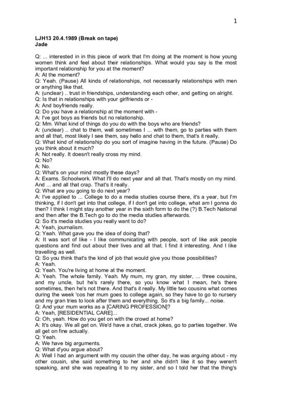 LJH13 20.4.1989 (Break on tape) Jade Q: ... interested in in this piece of work that I'm doing at the moment is how young women think and feel about their relationships. What would you say is the most important relationship for you at the moment? A: At the moment? Q: Yeah. (Pause) All kinds of relationships, not necessarily relationships with men or anything like that. A: (unclear) .. trust in friendships, understanding each other, and getting on alright. Q: Is that in relationships with your girlfriends or A: And boyfriends really. Q: Do you have a relationship at the moment with A: I've got boys as friends but no relationship. Q: Mm. What kind of things do you do with the boys who are friends? A: (unclear) .. chat to them, well sometimes I ... with them, go to parties with them and all that, most likely I see them, say hello and chat to them, that's it really. Q: What kind of relationship do you sort of imagine having in the future. (Pause) Do you think about it much? A: Not really. It doesn't really cross my mind. Q: No? A: No. Q: What's on your mind mostly these days? A: Exams. Schoolwork. What I'll do next year and all that. That's mostly on my mind. And ... and all that crap. That's it really. Q: What are you going to do next year? A: I've applied to ... College to do a media studies course there, it's a year, but I'm thinking, if I don't get into that college, if I don't get into college, what am I gonna do then? I think I might stay another year in the sixth form to do the (?) B.Tech National and then after the B.Tech go to do the media studies afterwards. Q: So it's media studies you really want to do? A: Yeah, journalism. Q: Yeah. What gave you the idea of doing that? A: It was sort of like - I like communicating with people, sort of like ask people questions and find out about their lives and all that. I find it interesting. And I like travelling as well. Q: So you think that's the kind of job that would give you those possibilities? A: Yeah. Q: Yeah. You're living at home at the moment. A: Yeah. The whole family. Yeah. My mum, my gran, my sister, ... three cousins, and my uncle, but he's rarely there, so you know what I mean, he's there sometimes, then he's not there. And that's it really. My little two cousins what comes during the week 'cos her mum goes to college again, so they have to go to nursery and my gran tries to look after them and everything. So it's a big family... noise. Q: And your mum works as a [CARING PROFESSION]? A: Yeah, [RESIDENTIAL CARE]... Q: Oh, yeah. How do you get on with the crowd at home? A: It's okay. We all get on. We'd have a chat, crack jokes, go to parties together. We all get on fine actually. Q: Yeah. A: We have big arguments. Q: What d'you argue about? A: Well I had an argument with my cousin the other day, he was arguing about - my other cousin, she said something to her and she didn't like it so they weren't speaking, and she was repeating it to my sister, and so I told her that the thing's 2 done, ended, so why shouldn't people let it go? And she told me to shut up and then we just started an argument then and now I'm not speaking to her. Q: Ah. What do you think the chances of making up are? A: Okay. We sort of like - there was me and my sister and my cousin and my sister's friend all sitting chatting yesterday, chatting about everyday life, like a party my friend's gonna have and... all sitting down listening to each other's stories and everything. Like when we have a argument we always sort of like chat anyway, a few weeks, three to four weeks afterwards. Q: Ah, so it's not too bad. You don't harbour grudges. A: No, no. Q: Like a lot of people don't speak for twenty years. A: No. Q: None of that stuff, you work it out. So one of the other things that we're interested in talking about is the sex education, that you are having, if you are having it still. A: No, we don't have it no more. Q: You don't have it anymore? What age were you when you were having it mainly? A: Round - from the first year from thirteen ... up to the fifth year. Fifteen. Q: Did you find you were learning much from it? A: Well I used to find it quite - sometimes you used to find it boring, sometimes you used to find it interesting. Q: Which were boring, which were interesting? A: Like the first year to the third year was boring, the fourth year to the fifth year was interesting. That's when the AIDS started coming in, they were chatting about AIDS and all different kinds of contraceptions and all that crap. That was quite interesting. But... it was sort of like... sex education, it's sort of like sit down and have, girls, sort of like, girls here and boys there, all chatting about sex education... it was okay. You learned quite a bit from that lesson. Q: Yeah... You were talking about the sort of sex education that you were given at school, which bits were interesting, which bits weren't; and then you mentioned that you got more interested when they were talking about AIDS. Was it mainly school that you heard about AIDS from or A: I heard about it from...newspapers, media really, sort of like people chatting about it. Q: What did - what do you think you know about it? What do you know about it? A: What do I know about AIDS? Er - that it's a sexually transmitted disease. You only get it if you have sexual intercourse with an infected person. You can get it by kissing, but a really long sort of kiss, but that's only a little bit in it so - that's really it really. That you can die of it, you don't really see the symptoms until years after, isn't it? Q: Mm. Do you see any difference between HIV and AIDS? A: I don't really know much about HIV but - I don't really know much about that one. Q: That's the virus which actually causes the A: AIDS Q: Yeah, well it weakens your immune system so that you then can be - get these various diseases which people die of with AIDS. So there's a bit of a distinction between the virus - it's that which you can have for years and not e