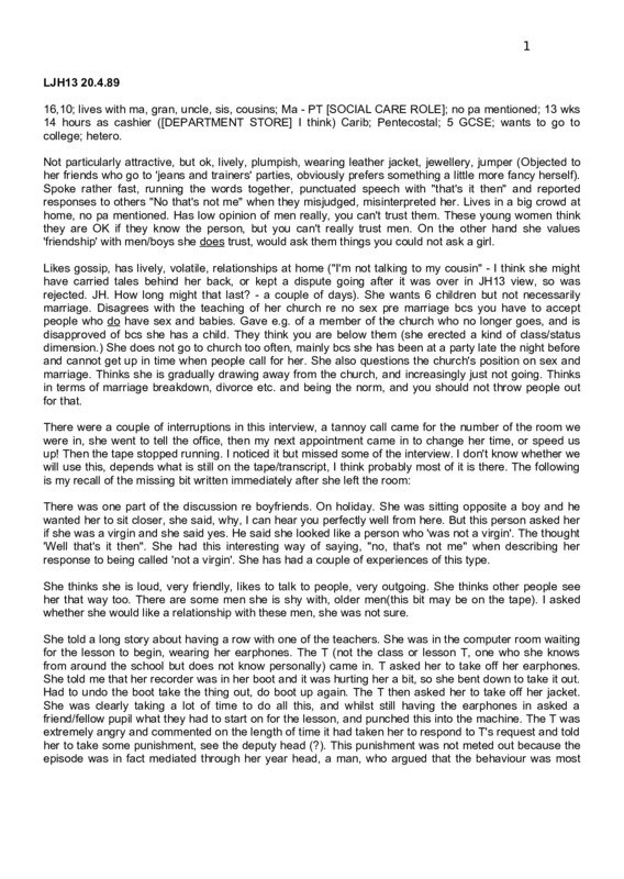 Interview with Jade, 16-17, Caribbean, upper working class, no religion. Women, Risk and AIDS Project, London, 1989. Anonymised version including field notes. (Ref: LJH13)