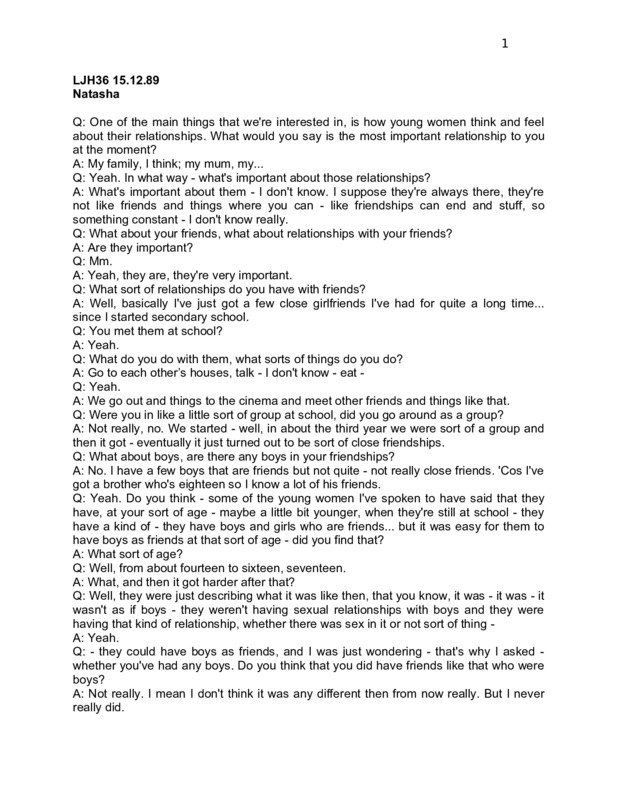 Interview with Natasha, 16-17, British, working class, no religion. Women, Risk and AIDS Project, London, 1989. Anonymised version including field notes. (Ref: LJH36)