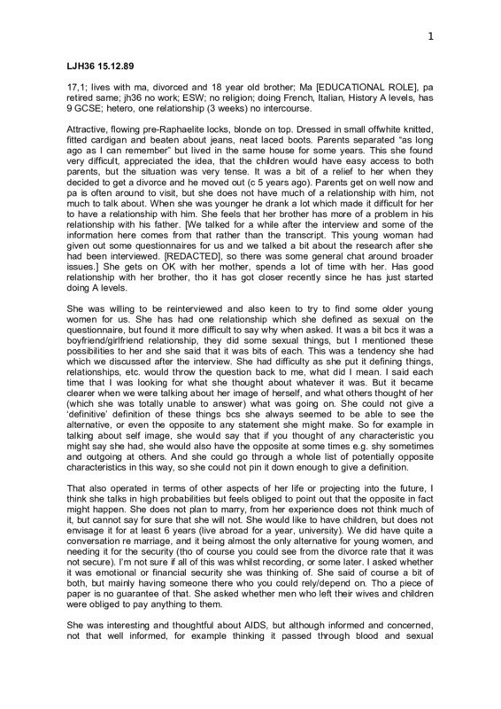 LJH36 15.12.89 Natasha Q: One of the main things that we're interested in, is how young women think and feel about their relationships. What would you say is the most important relationship to you at the moment? A: My family, I think; my mum, my... Q: Yeah. In what way - what's important about those relationships? A: What's important about them - I don't know. I suppose they're always there, they're not like friends and things where you can - like friendships can end and stuff, so something constant - I don't know really. Q: What about your friends, what about relationships with your friends? A: Are they important? Q: Mm. A: Yeah, they are, they're very important. Q: What sort of relationships do you have with friends? A: Well, basically I've just got a few close girlfriends I've had for quite a long time... since I started secondary school. Q: You met them at school? A: Yeah. Q: What do you do with them, what sorts of things do you do? A: Go to each other’s houses, talk - I don't know - eat Q: Yeah. A: We go out and things to the cinema and meet other friends and things like that. Q: Were you in like a little sort of group at school, did you go around as a group? A: Not really, no. We started - well, in about the third year we were sort of a group and then it got - eventually it just turned out to be sort of close friendships. Q: What about boys, are there any boys in your friendships? A: No. I have a few boys that are friends but not quite - not really close friends. 'Cos I've got a brother who's eighteen so I know a lot of his friends. Q: Yeah. Do you think - some of the young women I've spoken to have said that they have, at your sort of age - maybe a little bit younger, when they're still at school - they have a kind of - they have boys and girls who are friends... but it was easy for them to have boys as friends at that sort of age - did you find that? A: What sort of age? Q: Well, from about fourteen to sixteen, seventeen. A: What, and then it got harder after that? Q: Well, they were just describing what it was like then, that you know, it was - it was - it wasn't as if boys - they weren't having sexual relationships with boys and they were having that kind of relationship, whether there was sex in it or not sort of thing A: Yeah. Q: - they could have boys as friends, and I was just wondering - that's why I asked whether you've had any boys. Do you think that you did have friends like that who were boys? A: Not really. I mean I don't think it was any different then from now really. But I never really did. 2 Q: I noticed from your questionnaire that you said, when you were talking about being at school - sex education, that was the main thing that we asked you about, about which you were a little bit dismissive. I mean, how was it, what was it like? A: It was very bad, I think. I think... it was, I mean it was like - I mean it's difficult to remember like when we actually had it, 'cos we used to have like certain parts of our up to like the third year when we chose our GCSE options and things, we used to have like subjects working on a rota. So we'd have health education once every however long. And it wasn't very often, so it was very kind of - and it didn't sort of start until about the third year. Which I think in some ways is too late for a lot of people. And also the thing is that it was mixed and I thought that was really bad, 'cos it just meant that the boys were really stupid, and - and so - it was also taught badly as well. Q: Who actually taught it? A: There were a couple of teachers Q: Were they just subject teachers who had to do A: No, Health Education teachers, who taught kind of Child Development and things like that as well. But there was never like a kind of - we followed a course when we started, you know. It was just very kind of all over the place. Q: ...You did say though, that you had something about relationships. 'Cos that's one of the things that a lot of the young women said was lacking about relationships, it was all about the technical aspects. A: Yeah, it was, but it wasn't - it was kind of like we watched these films that were made in the seventies about this - I don't know if you've seen them, I've forgotten what they were called - about this couple - I don't know, they were about sixteen, they were at school, and the girl gets pregnant. And it's like a sort of series - it was really out of date, I mean - but it was - and that's what - I mean we sort of - they tried to sort of talk about relationships, but it was very difficult. 'Cos I mean you can't really - unless you have like very small groups of kind of, you know - you can't really - I don't think you can really talk about it as a massive group of boys and girls at that, it just kind of - I don't know, it wasn't very - it was never really very productive. Q: ... is this too much milk, I can pour some out... some sugar... Well, what sort of things - have you left school now? A: No, I'm at the sixth form centre. Q: And what sort of subjects are you doing - well, I know what subjects you're doing. What made you choose to do those? A: What made me choose to do those Q: French, Italian and A: - and History. Well, I chose Italian because we'd been to Italy for six months and I took my O-level a couple of years ago, and I wanted to do Italian A-level. And that kind of worked well with French, and I like French anyway, and I liked History as well, quite interesting. I didn't wanna do like all languages, I wanted to do something sort of... History. Q: What - what do you think you might do with these A-levels, should you get them? A: I suppose eventually go to university, probably do French and Italian or something. But before that I'd like to go and live in Italy or France, do some sort of exchange thing, for a year maybe and then sort of decide what I wanna do. 'Cos I'm not sort of sure 3 about what course or, you know, even what I want to do eventually, I've got no idea. So I'll just leave it to the 