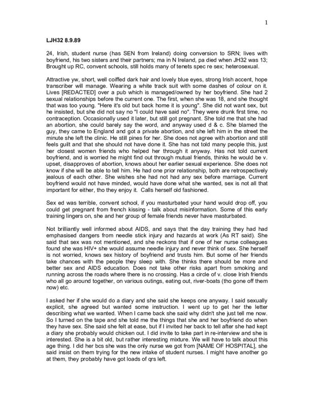 Interview with Siobhan, 24, Irish, middle class, Roman Catholic. Women, Risk and AIDS Project, London, 1989. Anonymised version including field notes. (Ref: LJH32)