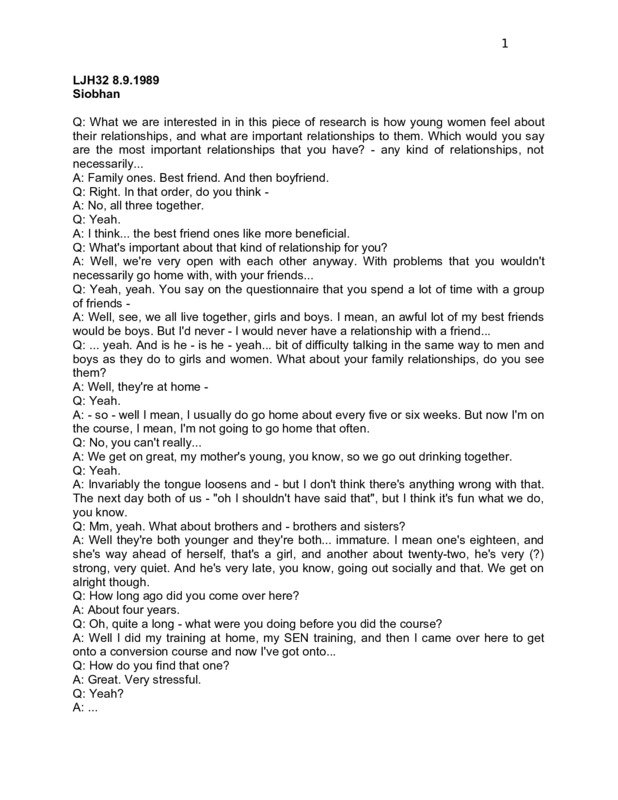 LJH32 8.9.1989 Siobhan Q: What we are interested in in this piece of research is how young women feel about their relationships, and what are important relationships to them. Which would you say are the most important relationships that you have? - any kind of relationships, not necessarily... A: Family ones. Best friend. And then boyfriend. Q: Right. In that order, do you think A: No, all three together. Q: Yeah. A: I think... the best friend ones like more beneficial. Q: What's important about that kind of relationship for you? A: Well, we're very open with each other anyway. With problems that you wouldn't necessarily go home with, with your friends... Q: Yeah, yeah. You say on the questionnaire that you spend a lot of time with a group of friends A: Well, see, we all live together, girls and boys. I mean, an awful lot of my best friends would be boys. But I'd never - I would never have a relationship with a friend... Q: ... yeah. And is he - is he - yeah... bit of difficulty talking in the same way to men and boys as they do to girls and women. What about your family relationships, do you see them? A: Well, they're at home Q: Yeah. A: - so - well I mean, I usually do go home about every five or six weeks. But now I'm on the course, I mean, I'm not going to go home that often. Q: No, you can't really... A: We get on great, my mother's young, you know, so we go out drinking together. Q: Yeah. A: Invariably the tongue loosens and - but I don't think there's anything wrong with that. The next day both of us - "oh I shouldn't have said that", but I think it's fun what we do, you know. Q: Mm, yeah. What about brothers and - brothers and sisters? A: Well they're both younger and they're both... immature. I mean one's eighteen, and she's way ahead of herself, that's a girl, and another about twenty-two, he's very (?) strong, very quiet. And he's very late, you know, going out socially and that. We get on alright though. Q: How long ago did you come over here? A: About four years. Q: Oh, quite a long - what were you doing before you did the course? A: Well I did my training at home, my SEN training, and then I came over here to get onto a conversion course and now I've got onto... Q: How do you find that one? A: Great. Very stressful. Q: Yeah? A: ... 2 Q: Yeah? What sort of - what happened? A: Well, just exams... crazy - I know I always get upset about - I did two papers the other day in the exam. One, God I done it brilliantly, and the other one I thought was a load of rubbish. I got a much, much higher per cent for the rubbish, and I'm just thinking, I'll go mad. Q: Yeah. A: If this is what nursing is, I'm leaving. The one that - the one that they thought wasn't as good, I mean I passed both, and I'm going to see them about it because I put in every single point that was relevant. Say I used some of things of the psychiatric... that should have got marked... It's not like - seclusion rooms - well I don't either, but they are used, so we can't... from that... Q: Yeah... but it's a question of a sort of batch of material rather than A: I mean you can't be... give us a lecture. You know, you can never be biased or let your own sort of attitudes, you know, influence the way you look on... When I got home... Q: Yeah, yeah, sure. Well you passed them both, that's A: I know, well, that's why I can... Q: Yeah, yeah. Still I mean it is annoying if you... - I could never judge actually, I always used to think, oh my God, I've probably failed that, and then do quite well, you know. I just was in such a state of nerves when I was doing exams, I couldn't remember clearly what I'd written down and stuff like that. A: I mean I got seventy-five percent for the second, and I still think it was rubbish! Q: Pretty good. A: ... Q: Well, let's talk about more pleasant things. Let me ask you about your relationship with your current boyfriend. A: Oh, well this is the business, this one. We'll get married and Q: Yeah. A: But with the course and everything, I'm just not ready to just yet. Q: Mm. How long have you known him? A: I've been going out with him for about two years. Q: And you met him over here? A: Yeah. Q: And A: Well, I actually knew all of his family very well except him. Q: What, from home? A: From here. Q: From here. Is he from here? A: Well, he's from home but he's living over here now. Q: Yeah. And - it's a sexual relationship...? A: Yeah. Q: What made you decide - I mean when - when did you decide that it would be a sexual relationship? I mean did you spend did you spend time... quite long before or short or - 3 A: Well... as I put on the survey, or the questionnaire, I've had like two sexual relationships before. The first one - I always - I still say that if I had to live my life again, I wouldn't, before marriage. Q: Yeah. A: And I really - like I try to sort of enforce that on my sister. Not in a sort of judgmental way, but just from my experience. I definitely wouldn't enter it too early. Q: Mm. What was sort of - what was the situation with the first? A: I don't know, I just - well I (?) thought I was in love. Q: Don't we all! A: ... Q: How old were you? A: I think I was very easily influenced, I mean not as a rule, but then I went over. I went over to my friend's, and I said, "Guess what!" and I said "never!" You know, that was exact, my reaction, you know. And they said... Weeks later and I did it. I was in a state. Q: At the time though, did - I mean who decided that you would make it into a sexual relationship? Was he putting pressure on you A: Yeah. Q: - or did you decide? A: I don't mean that horribly, because - I mean, my present boyfriend wouldn't care honestly if we never did. I mean, he doesn't think it's all-important. He likes it obviously, but I mean, he almost - I mean, he doesn't like me being on the pill at all, and would much rather that I did come off it because it - of the damage it does. Q: The effects of it, yeah. Are you worried about that? A: Not particularly, no. I m