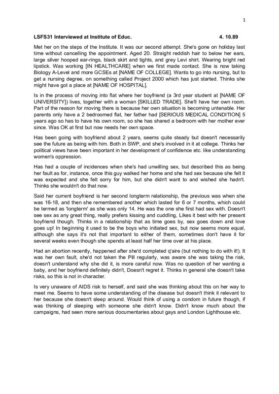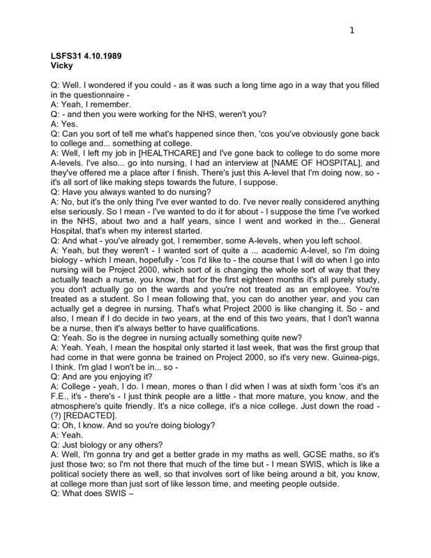 LSFS31 4.10.1989 Vicky Q: Well. I wondered if you could - as it was such a long time ago in a way that you filled in the questionnaire A: Yeah, I remember. Q: - and then you were working for the NHS, weren't you? A: Yes. Q: Can you sort of tell me what's happened since then, 'cos you've obviously gone back to college and... something at college. A: Well, I left my job in [HEALTHCARE] and I've gone back to college to do some more A-levels. I've also... go into nursing, I had an interview at [NAME OF HOSPITAL], and they've offered me a place after I finish. There's just this A-level that I'm doing now, so it's all sort of like making steps towards the future, I suppose. Q: Have you always wanted to do nursing? A: No, but it's the only thing I've ever wanted to do. I've never really considered anything else seriously. So I mean - I've wanted to do it for about - I suppose the time I've worked in the NHS, about two and a half years, since I went and worked in the... General Hospital, that's when my interest started. Q: And what - you've already got, I remember, some A-levels, when you left school. A: Yeah, but they weren't - I wanted sort of quite a ... academic A-level, so I'm doing biology - which I mean, hopefully - 'cos I'd like to - the course that I will do when I go into nursing will be Project 2000, which sort of is changing the whole sort of way that they actually teach a nurse, you know, that for the first eighteen months it's all purely study, you don't actually go on the wards and you're not treated as an employee. You're treated as a student. So I mean following that, you can do another year, and you can actually get a degree in nursing. That's what Project 2000 is like changing it. So - and also, I mean if I do decide in two years, at the end of this two years, that I don't wanna be a nurse, then it's always better to have qualifications. Q: Yeah. So is the degree in nursing actually something quite new? A: Yeah. Yeah, I mean the hospital only started it last week, that was the first group that had come in that were gonna be trained on Project 2000, so it's very new. Guinea-pigs, I think. I'm glad I won't be in... so Q: And are you enjoying it? A: College - yeah, I do. I mean, mores o than I did when I was at sixth form 'cos it's an F.E., it's - there's - I just think people are a little - that more mature, you know, and the atmosphere's quite friendly. It's a nice college, it's a nice college. Just down the road (?) [REDACTED]. Q: Oh, I know. And so you're doing biology? A: Yeah. Q: Just biology or any others? A: Well, I'm gonna try and get a better grade in my maths as well, GCSE maths, so it's just those two; so I'm not there that much of the time but - I mean SWIS, which is like a political society there as well, so that involves sort of like being around a bit, you know, at college more than just sort of like lesson time, and meeting people outside. Q: What does SWIS – 2 A: Socialist Workers' Student Society. Yeah. Q: Is that to do with the SWP? A: Yeah, it is, yeah, yeah. Yeah, it's only me and this other woman there, so I mean we're both new to the college so we're sort of like finding our feet. So not sort of - just get people interested politically in what we've got to say. It's good. Q: Have you done that before? A: No. Q: I mean, were you politically interested at school? A: Well, I've been in the SWP for about two and a half years, on and off. But not - not when I was at school, not really, I was sort of like lefty sort of thing, in the sense, you know, women's rights and that sort of thing, and trying to sort of like break - I knew what the stereotypes were 'cos my of sister and things like that, she's got like kids and that, and I've always sort of like seen that's not what I wanted to do, whereas had a career and I, you know, thought of that first of all I suppose. That's about it - not any sort of like sound - I didn't actually put myself with any like political party, or, you know, any like tradition or whatever. Q: Is - your sister's presumably older than you? A: Yeah, my sister's thirty, yeah, she's a lot older than me. Ten years. Yeah. Q: And so was it just the two of you A: No. My brother - my brother is in the SWP as well, my brother's a [CARING PROFESSION], so, you know - I'm following in his footsteps pretty much, you know. He's - my brother's twenty-seven. But I mean I'm closer to him, I get on better with him, more in common. There's just the three of us. Q: And are you the only one left at home? A: I'm not livQ: You're not A: Well, I'm in the stage of sort of moving out but - the house we're living in is - I mean, it's - I mean it's not sort of "home sweet home" at the moment, so I'm sort of darting between there and my mum's house. So - in the process of moving out, making a big step. Q: Have you lived away from home before? A: No, no, never. Q: And is it your mum and dad at home? A: Yeah, and also because - the situation's that we only live in a two bedroom flat because my dad is actually - my dad suffered a [SERIOUS MEDICAL CONDITION] and he has to have his own room, so I have to share a room with my mum, which is - as I'm getting older it's sort of, you know Q: ... A: Yeah, it's not a good idea really. Creates hassle which, you know, doesn't need to happen, you should just move out and - I suppose it's better, I've been getting on with them a lot better since I moved out rather than screaming "get out" every time you want to have a bit of peace and quiet. Q: What, them screaming at you or A: Ah, me - each way, you know, they scream at me and Q: So how long have you been sharing with your mum? A: [REDACTED], so - since about - about five years actually, yeah, about five years. 3 Q: That's quite a long time. A: Yeah. Yeah, I didn't really used to mind that much, it's just - you can't - when you're younger you don't care so much, but you wanna have pictures on the walls, you know, just silly things, you know. And you just wanna be able to - if you 