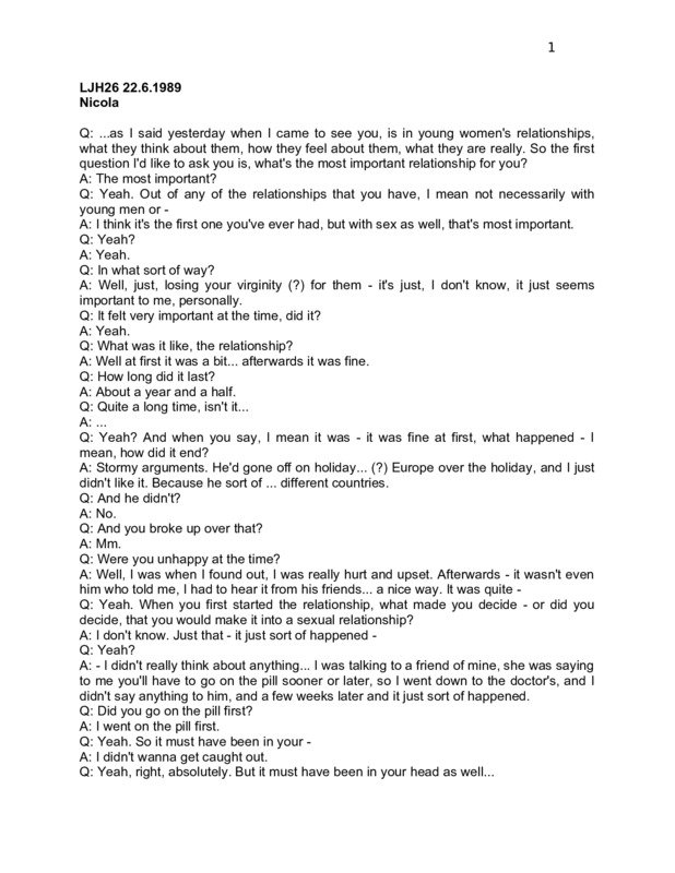 LJH26 22.6.1989 Nicola Q: ...as I said yesterday when I came to see you, is in young women's relationships, what they think about them, how they feel about them, what they are really. So the first question I'd like to ask you is, what's the most important relationship for you? A: The most important? Q: Yeah. Out of any of the relationships that you have, I mean not necessarily with young men or A: I think it's the first one you've ever had, but with sex as well, that's most important. Q: Yeah? A: Yeah. Q: In what sort of way? A: Well, just, losing your virginity (?) for them - it's just, I don't know, it just seems important to me, personally. Q: It felt very important at the time, did it? A: Yeah. Q: What was it like, the relationship? A: Well at first it was a bit... afterwards it was fine. Q: How long did it last? A: About a year and a half. Q: Quite a long time, isn't it... A: ... Q: Yeah? And when you say, I mean it was - it was fine at first, what happened - I mean, how did it end? A: Stormy arguments. He'd gone off on holiday... (?) Europe over the holiday, and I just didn't like it. Because he sort of ... different countries. Q: And he didn't? A: No. Q: And you broke up over that? A: Mm. Q: Were you unhappy at the time? A: Well, I was when I found out, I was really hurt and upset. Afterwards - it wasn't even him who told me, I had to hear it from his friends... a nice way. It was quite Q: Yeah. When you first started the relationship, what made you decide - or did you decide, that you would make it into a sexual relationship? A: I don't know. Just that - it just sort of happened Q: Yeah? A: - I didn't really think about anything... I was talking to a friend of mine, she was saying to me you'll have to go on the pill sooner or later, so I went down to the doctor's, and I didn't say anything to him, and a few weeks later and it just sort of happened. Q: Did you go on the pill first? A: I went on the pill first. Q: Yeah. So it must have been in your A: I didn't wanna get caught out. Q: Yeah, right, absolutely. But it must have been in your head as well... 2 A: He was... I just wouldn't listen to him, you know, just don't worry about it, not yet. Q: Yeah. A: But - that's it. Q: How was it, I mean was it enjoyable or A: I was really scared at first, really scared, but it was enjoyable afterwards. Q: Yeah. What were you scared of, just what was gonna happen or A: Yeah, 'cos I didn't really go and chat to anybody about it or Q: Yeah. Hard to know what is going to A: Yeah. Q: What about the other relationships after that one? A: No, not all of them Q: - had sex with A: - hardly any of them. Q: Yeah. How did - how did you decide which ones would and which ones wouldn't? A: It was the way they treated me. Q: Yeah? A: If they didn't treat me like I thought I should be treated - I like to be treated nicely, like most people do. But if they, you know, I just - I don't know, get out of this. Q: Mm. And that's what you did? A: Yeah, just got out. Q: What about now, are you in a relationship now? A: Sort of. Q: Yeah? A: ... Q: And is there sex in that one? A: Yeah. Q: How do you feel about that? A: Well, I feel like I'm sort of playing second best, 'cos like he's got a... he's being a bit... he's got a girlfriend at work, and I've got a bloke after me, keeps asking me questions, and saying I'll let you know, I'll let you know. But the bloke I'm with, that I'm going with has got a girlfriend; he says to me, look, you should go out 'cos then both of us - it won't seem... on you or me 'cos you'll be going out with somebody as well. Q: Yeah. How do you feel about that? A: I don't - well I've never had a relationship like this before Q: Yeah. A: - and at first - at first it was sort of like, oh, you know, it was just sort of - oh, this has happened to me, you know, it was great, but afterwards it just got so - well, because I'm only playing second best and I don't like it. Q: Mm. How do you feel about the other - the other girl, the other woman? - his other girlfriend. A: We nearly got caught out, like we were up at the flat and the doorbell kept ringing and he said the only person that would ring like that is my girlfriend... so he just rushed me out... Being all secretive I don't like. Q: Yeah. So what made you decide - did you know he had a girlfriend at first, or did you just discover after you became involved? 3 A: No, I didn't. Yeah, it was like - afterwards, he showed me photos of her. I said, oh, nice, aren't they lovely. Q: ... when he said he had another girlfriend? A: Well, the way he made it sound was that he doesn't - he didn't really bother, he didn't care if he had one or not. Q: Mm, what, her or you sort of thing? A: No, it's sort of like when I'm with him he doesn't really mention her, but I ask him about her, and he says, oh, she's alright, I suppose... Q: Yeah... with you 'cos... with her and sort of... A: That's it, yeah. Q: Yeah. But you find it a bit - you (?) don't fancy it? A: Mm. Q: What do you think you'll do? Have you decided yet? A: The elbow. Q: Yeah, yeah. How long ago - how long has it been going on? A: It hasn't been going on long, about six weeks or such. Q: ... feel that you're not that involved. A: No. Q: Yeah. So why are you in it at all, is it - is it...? A: It's just a laugh, I suppose. Q: Yeah. A: I didn't really - I wasn't looking for anything to happen, like just, he was just sort of... and that was it. I just sort of said to him, what are you doing tonight, and he said oh, nothing. I was a bit shocked but - I don't normally get involved with people that... like close that I talk to every day, it's - I was just shocked at first, but it was a bit of fun. It's not fun anymore. Q: Yeah. Well is it gonna be difficult, then, if you see him every day, or do you - or do you sort of still... A: I haven't seen him... every day. Q: I mean as - as, you know, a kind of friendship or - rather A: Yeah, I - I know... Q: ... A: - about two years ago... (interruption)... about
