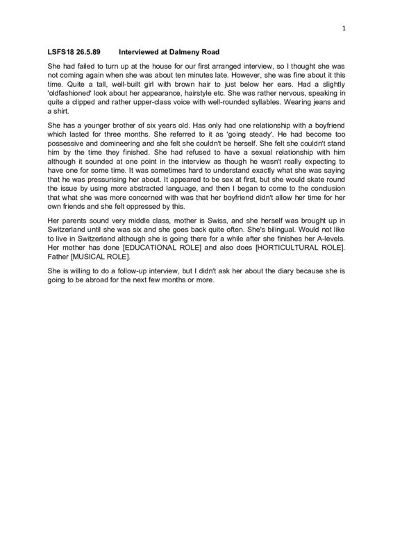 Interview with Eliza, British and Swiss, middle class, no religion. Women, Risk and AIDS Project, London, 1989. Anonymised version including field notes. (Ref: LSFS18)