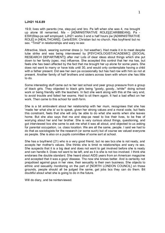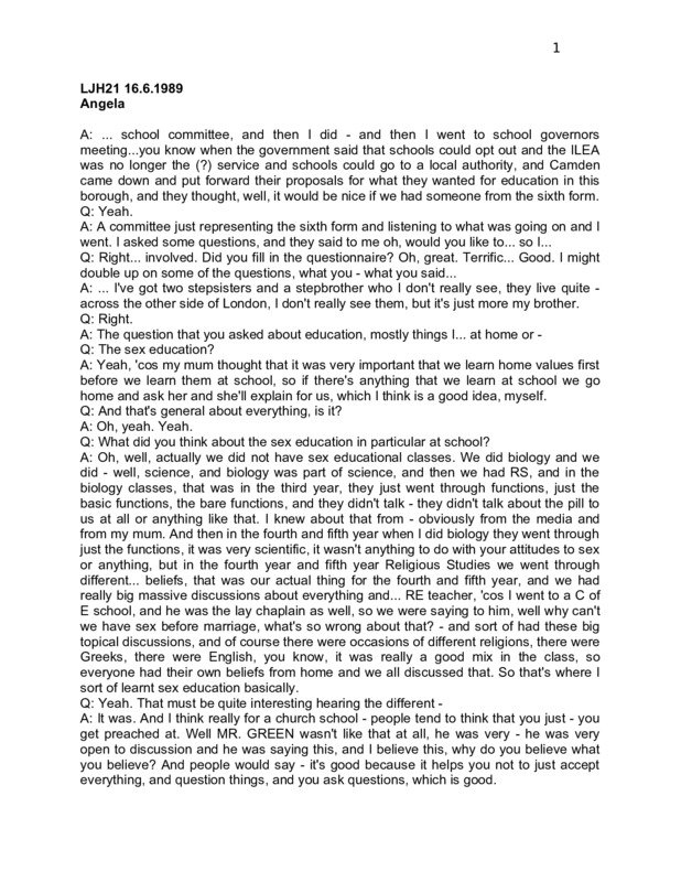 LJH21 16.6.1989 Angela A: ... school committee, and then I did - and then I went to school governors meeting...you know when the government said that schools could opt out and the ILEA was no longer the (?) service and schools could go to a local authority, and Camden came down and put forward their proposals for what they wanted for education in this borough, and they thought, well, it would be nice if we had someone from the sixth form. Q: Yeah. A: A committee just representing the sixth form and listening to what was going on and I went. I asked some questions, and they said to me oh, would you like to... so I... Q: Right... involved. Did you fill in the questionnaire? Oh, great. Terrific... Good. I might double up on some of the questions, what you - what you said... A: ... I've got two stepsisters and a stepbrother who I don't really see, they live quite across the other side of London, I don't really see them, but it's just more my brother. Q: Right. A: The question that you asked about education, mostly things I... at home or Q: The sex education? A: Yeah, 'cos my mum thought that it was very important that we learn home values first before we learn them at school, so if there's anything that we learn at school we go home and ask her and she'll explain for us, which I think is a good idea, myself. Q: And that's general about everything, is it? A: Oh, yeah. Yeah. Q: What did you think about the sex education in particular at school? A: Oh, well, actually we did not have sex educational classes. We did biology and we did - well, science, and biology was part of science, and then we had RS, and in the biology classes, that was in the third year, they just went through functions, just the basic functions, the bare functions, and they didn't talk - they didn't talk about the pill to us at all or anything like that. I knew about that from - obviously from the media and from my mum. And then in the fourth and fifth year when I did biology they went through just the functions, it was very scientific, it wasn't anything to do with your attitudes to sex or anything, but in the fourth year and fifth year Religious Studies we went through different... beliefs, that was our actual thing for the fourth and fifth year, and we had really big massive discussions about everything and... RE teacher, 'cos I went to a C of E school, and he was the lay chaplain as well, so we were saying to him, well why can't we have sex before marriage, what's so wrong about that? - and sort of had these big topical discussions, and of course there were occasions of different religions, there were Greeks, there were English, you know, it was really a good mix in the class, so everyone had their own beliefs from home and we all discussed that. So that's where I sort of learnt sex education basically. Q: Yeah. That must be quite interesting hearing the different A: It was. And I think really for a church school - people tend to think that you just - you get preached at. Well MR. GREEN wasn't like that at all, he was very - he was very open to discussion and he was saying this, and I believe this, why do you believe what you believe? And people would say - it's good because it helps you not to just accept everything, and question things, and you ask questions, which is good. 2 Q: Mm, yeah, definitely. So - yeah. You say here that you're Christian but you – A: Well, I don't say - call myself a Christian 'cos it's got so many different angles to it that - people just sort of say well, you're a Christian, you must be this and that, but I believe in God. Q: And do you think that it does affect your - that that affects the way that you run your life, or... just principles? A: Yeah, I suppose to an extent, to an extent, and not a hundred per cent though. I - I run my life according to how my family - I suppose I follow my family's values, and - and I suppose I look at things and I work out for myself how I... And I don't just sort of say, well look, because I'm a Christian I must do this or I must do that. Q: Mm, yeah. A: ... so no. Q: So you make your own judgements about these things. A: Yeah. Q: I just wondered because some people - I mean I've spoken to quite a few people of different religions, some of which... have been quite - had quite strong A: Rigid. Q: Yeah, views about sexual behaviour, and they're quite varied in their response, I mean they're likely to make their own decisions. They use that as a sort of reference point rather than A: Right. Q: - as a sort of... A: I think you can't just stick to a dogma or a belief, you - the world changes so much that you have to - you have to fit in, you can't just be standing out from it and there it is in front of you, you've got to - you've got to live in it, it's around you so you have to adapt and you have to - not - not give up what you believe, but you have to really assess things all the time,... according to changes you have to reassess things. Q: The other thing - I mean one of the things we're very interested in, apart from finding out what your sex education at school was like, is relationships. I've been asking a few people what is the most important thing about relationships for them. A: Oh, yeah. I think it's - I think it's getting to know other people, it doesn't matter which sex they are, it's getting to know other people, and it helps you 'cos you - everyone's different, we're all different personalities and if you - I mean you can't just stick around with the same bunch of people all the time, you have to actually get to know people personally so that you learn how to deal with people on a personal basis. And if you have a close friend, be it male or female, it just helps you to develop yourself as well because them being close to you, they can tell you things about yourself that you didn't see, and you can tell them things, and you help each other because you're so close. And - well the friend that I - I've got two friends that are very close and they're
