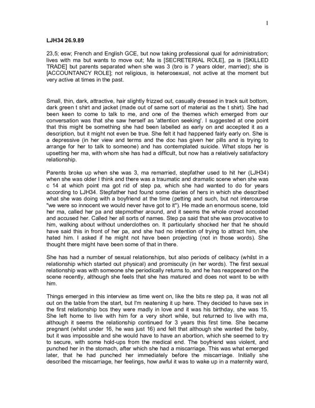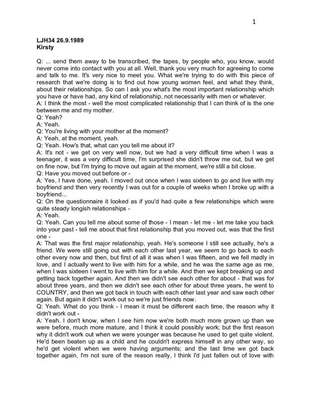 LJH34 26.9.1989 Kirsty Q: ... send them away to be transcribed, the tapes, by people who, you know, would never come into contact with you at all. Well, thank you very much for agreeing to come and talk to me. It's very nice to meet you. What we're trying to do with this piece of research that we're doing is to find out how young women feel, and what they think, about their relationships. So can I ask you what's the most important relationship which you have or have had, any kind of relationship, not necessarily with men or whatever. A: I think the most - well the most complicated relationship that I can think of is the one between me and my mother. Q: Yeah? A: Yeah. Q: You're living with your mother at the moment? A: Yeah, at the moment, yeah. Q: Yeah. How's that, what can you tell me about it? A: It's not - we get on very well now, but we had a very difficult time when I was a teenager, it was a very difficult time, I'm surprised she didn't throw me out, but we get on fine now, but I'm trying to move out again at the moment, we're still a bit close. Q: Have you moved out before or A: Yes, I have done, yeah. I moved out once when I was sixteen to go and live with my boyfriend and then very recently I was out for a couple of weeks when I broke up with a boyfriend... Q: On the questionnaire it looked as if you'd had quite a few relationships which were quite steady longish relationships A: Yeah. Q: Yeah. Can you tell me about some of those - I mean - let me - let me take you back into your past - tell me about that first relationship that you moved out, was that the first one A: That was the first major relationship, yeah. He's someone I still see actually, he's a friend. We were still going out with each other last year, we seem to go back to each other every now and then, but first of all it was when I was fifteen, and we fell madly in love, and I actually went to live with him for a while, and he was the same age as me, when I was sixteen I went to live with him for a while. And then we kept breaking up and getting back together again. And then we didn't see each other for about - that was for about three years, and then we didn't see each other for about three years, he went to COUNTRY, and then we got back in touch with each other last year and saw each other again. But again it didn't work out so we're just friends now. Q: Yeah. What do you think - I mean it must be different each time, the reason why it didn't work out A: Yeah. I don't know, when I see him now we're both much more grown up than we were before, much more mature, and I think it could possibly work; but the first reason why it didn't work out when we were younger was because he used to get quite violent. He'd been beaten up as a child and he couldn't express himself in any other way, so he'd get violent when we were having arguments; and the last time we got back together again, I'm not sure of the reason really, I think I'd just fallen out of love with 2 him, and I was hanging onto him but I didn't really love him. So I realised that and then we broke up. Q: Yeah. Was he violent the second time around? A: No. He wasn't actually violent, I was always frightened that he would be, the anticipation was worse really, but then he never actually was, but I was always frightened, so that might have had something to do with it. Q: That first time when you first started the relationship, was it the first sexual relationship that you'd had? A: Yeah. Q: And how - how did it come about, I mean what made you decide to make it into a sexual relationship? Did you decide or A: Well, we both actually decided it, it was his birthday, and we just decided that we loved each other and we actually got engaged at this time, this was when I was fifteen, and we decided we wanted to be together so we decided to have a sexual relationship. Q: Did you use contraception the first time? A: Yes, we did, we used condoms, yeah. Q: Have you always done that or A: Used contraception? I actually got pregnant after that, we did use condoms when we first started out but I went to the doctor to ask to go on the pill, and the doctor wouldn't do it without my mum's permission, and I felt there was no way I could face my mum she didn't talk about things like that, so we carried on, and we used condoms sometimes, and other times we didn't, and I got pregnant. But then I had a miscarriage Q: Yeah. A: - so that solved itself really. Q: Was that very upsetting or was it... A: It was pretty awful because, apparently the nurses told my mum that I almost died, and I said to her I was having pains, and she thought it was appendicitis, and then I told her that I was pregnant. I lost a lot of blood and the doctor came, I went to the hospital, and it seems that I lost a couple of days, I think I was unconscious for a couple of days while they operated, and when I woke up she was very good but it must have been awful for her. I felt that I'd really gone against her, I'd really upset her, but I mean I'm still upset now, when I see babies and things, I get very broody. It was pretty awful. Q: Do you think you - that you plan to have children at some point anyway? A: What, then Q: No. A: Oh, will I, oh yeah, I hope so, yeah. Q: Yeah, yeah. At the time that you had that it must have been quite early in the relationship. A: It was, it was probably about six months on that I actually got pregnant. Yeah. And Q: ... trauma, it didn't - I mean you kept together A: Yeah, I think it brought us actually closer together although it caused complications 'cos my mum - 'cos I was under sixteen when I actually got pregnant, and he was just over. She was obviously very upset about it and said that she was gonna take him to court, but she never did, but it caused complications because whenever he came round there was - there was trouble obviously Q: Yeah. That must have been very difficult at that point for you. 3 A: It was a very difficult time. I think - a few years later I actually had 