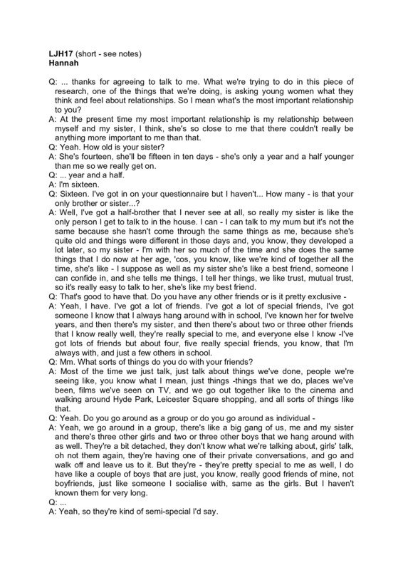 Hannah Q: ... thanks for agreeing to talk to me. What we're trying to do in this piece of research, one of the things that we're doing, is asking young women what they think and feel about relationships. So I mean what's the most important relationship to you? A: At the present time my most important relationship is my relationship between myself and my sister, I think, she's so close to me that there couldn't really be anything more important to me than that. Q: Yeah. How old is your sister? A: She's fourteen, she'll be fifteen in ten days - she's only a year and a half younger than me so we really get on. Q: ... year and a half. A: I'm sixteen. Q: Sixteen. I've got in on your questionnaire but I haven't... How many - is that your only brother or sister...? A: Well, I've got a half-brother that I never see at all, so really my sister is like the only person I get to talk to in the house. I can - I can talk to my mum but it's not the same because she hasn't come through the same things as me, because she's quite old and things were different in those days and, you know, they developed a lot later, so my sister - I'm with her so much of the time and she does the same things that I do now at her age, 'cos, you know, like we're kind of together all the time, she's like - I suppose as well as my sister she's like a best friend, someone I can confide in, and she tells me things, I tell her things, we like trust, mutual trust, so it's really easy to talk to her, she's like my best friend. Q: That's good to have that. Do you have any other friends or is it pretty exclusive A: Yeah, I have. I've got a lot of friends. I've got a lot of special friends, I've got someone I know that I always hang around with in school, I've known her for twelve years, and then there's my sister, and then there's about two or three other friends that I know really well, they're really special to me, and everyone else I know -I've got lots of friends but about four, five really special friends, you know, that I'm always with, and just a few others in school. Q: Mm. What sorts of things do you do with your friends? A: Most of the time we just talk, just talk about things we've done, people we're seeing like, you know what I mean, just things -things that we do, places we've been, films we've seen on TV, and we go out together like to the cinema and walking around Hyde Park, Leicester Square shopping, and all sorts of things like that. Q: Yeah. Do you go around as a group or do you go around as individual A: Yeah, we go around in a group, there's like a big gang of us, me and my sister and there's three other girls and two or three other boys that we hang around with as well. They're a bit detached, they don't know what we're talking about, girls' talk, oh not them again, they're having one of their private conversations, and go and walk off and leave us to it. But they're - they're pretty special to me as well, I do have like a couple of boys that are just, you know, really good friends of mine, not boyfriends, just like someone I socialise with, same as the girls. But I haven't known them for very long. Q: ... A: Yeah, so they're kind of semi-special I'd say. Q: Have you - have you had a close relationship with a boy? A: Yeah, several. About five boys - four boys and one man. Boys I'd say around seventeen years old and the man was twenty-seven. So... boys... Q: Yeah. Have those relationships included sex? A: Yeah. Q: When...was the first? A: The first one was with - I think it was just before - just before last Christmas, and that was the first time I'd ever had sex ever before, and he was my first boyfriend and I was quite serious about him at the time. But after - after the sexual experiences it kind of ebbed away, he was probably after one thing, which my mum is always talking to me about, they're after one thing and after they've had it they're off. I think she was right with him actually. Q: Yeah, yeah. What about the others, had you had sex with...? A: Not all of them, 'cos some of them - only the ones that really mean something to me, I mean I wouldn't - I wouldn't just have sex with any old person, I mean the oldest - the older man, I should say, he was - I went out with him for quite a long time, he was really special to me and so I did with him, one - I think there was one other, but not with any of the others 'cos I thought, well, you know, just something to pass the time. One I really really did love at the time, I wouldn't do it with anyone else, not anyone I didn't love. Q: Mm, yeah. What about now, is there anybody now? A: There is someone now but I - I haven't really been seeing him for very long and I think you have to really get to know a person before you would do something like that, and know - to know and love them, 'cos there's no point any - you know, another way, 'cos well it's just an expression of how much you love a person to do something like that. I mean to like give them - to give yourself to them, it's not really something you do with someone you don't really care about. That's why I don't understand how prostitutes can do it. Q: Yeah. A: ... money but it seems really awful, it's like a violation of your body, you know, it's horrible. Q: Well I suppose they just think differently about it from the way you do. A: Mm, yeah, I suppose so. Q: When - in the relationships which have included sex, have - have you used any form of contraception? A: Yeah. I wouldn't do it any other way, yeah. Used a condom, and I, you know didn't - well - with one he really discussed and discussed it before we actually even had sex, kind of talked over and should we do it and should we not do it and what will happen afterwards, and we talked about contraceptives then, he said, well, I don't think your mum would be very pleased - 'cos see, I was under sixteen then, you're not allowed to go and get the pill anyway then, and so he said I don't think your mum would be very pleased if, you know, she finds out that he