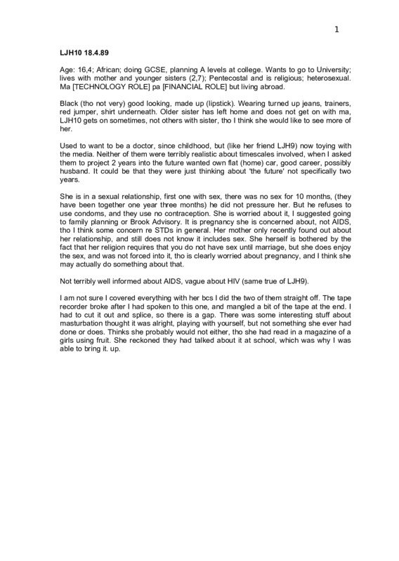 LJH10 18.4.1989 Hailey Q: ... information. I - I notice actually that your birthday's exactly the same birthday as mine. A: Is it? Ah. Q: A few years between us... quite interested in that. One of the things that we're interested in in this study that I'm doing is asking young women about relationships - how they think, what they think about them, how they feel about them, and so I was going to ask you which relationships or relationship is the most important to you? A: What, do you mean like say if you're going out with a boy? Q: Well any kind - what would be an important relationship to you? A: Having one with your mum is important but having one with your boyfriend which you know is gonna last I think is really important. 'Cos it shows how much you love each other and you can bring out your feelings more and everything, and if you know that you're gonna be with him for a long time then you can show how much you love each other. Q: How would you know that you're gonna be with somebody for a long time? A: Well you don't really know, because like I'm going out with this boy, I've been going out with him for a year and three months, but I thought that it was just gonna be a short relationship but we just took it day by day and we're still together. Q: Mm. How do you enjoy that relationship? A: I love him. Q: Yeah? Still okay after all this time? A: Yeah. We have had little arguments but he's still there. Q: How did you meet him? A: At LYNN's party. Q: Yeah? A: Yeah. This was in '87, New Year's Eve party. I was coming -'cos the party was just finished and we was coming out with my friend and he was out on the wall and he tripped me up but I turned around and I - I swore at him, and that was it. Q: Well, if that's what you did. A: I go, what you fucking doing, and I just walked off, and then he called my friend the next night and he goes... friends... and he told me to phone him and everything, so I phoned him the next day, it just went on from there. Q: Have you had other relationships before this one? A: Yeah, but not - not so intimate, just sort of like short ones really. Q: When you say "intimate", intimate personally or intimate physically or both? A: Both. Q: Both. A: Both. Q: Yeah. A: So like the other boyfriend I went out with, you know when you're in primary school, things like that, immature little things, sort of things like that. Q: Mm, yeah. Is - is he older than you or the same age? A: Yeah, he's nineteen. Q: Just a bit older. And the relationship - does it include sex? A: Yeah. Q: How did you decide - or did you decide that it would A: It took ten months, ten months - he wasn't pressuring me or anything 'cos I didn't really want to, but if - you know, he was just gonna leave it at that and if I decide it's up to me. He's not gonna force me or do anything against my will or anything like that. By the tenth month - 2 Q: - you decided. A: Yeah. Q: Was - was that the first relationship that you've had? A: Yeah. Q: How did you feel about it? A: On top of the world. Q: Yeah? A: Yeah. Q: You enjoyed it. A: Yeah. Q: Do you still? A: Yeah, yeah. Q: These are difficult things to talk about, I know. I'm asking you difficult questions. Did you - when you - when you first started making love, did you use contraception? A: No. Q: Do you now? A: No. Q: No? A: Nothing. Q: What makes you decide not to? A: We do talk about it sometimes, we did talk about it, but he goes that - 'cos it's a bit too much hassle, 'cos he thinks it's too much hassle and everything, and he thinks that it's got more - more chance of the condom bursting or something like that, that's what he thinks so he goes no. 'Cos he goes he knows when he's coming so therefore he can come out of me. Q: Mm. What, are you - are you happy with that or A: I trust him so Q: Mm. It's a little bit risky that method though, isn't it? A: I know. But he goes that if it did come to the point he'd rather prefer me to go on the pill or something but I don't wanna go on the pill. Q: Mm. Why's that, are you worried about it? A: Yeah. And I think it causes health risks and things like that... Q: What about other things, you could put a barrier inside, couldn't you, you could put a cap in. A: Mm. I haven't really thought about that. What, would I go to the family planning and -? Q: Yeah, you could go to family planning, you could go to Brook Advisory, and they would fix you with whatever form of contraception you wanted. I mean if you're worried about it A: Yeah. Q: 'Cos I mean - when you say you're worried about it, are you worried getting pregnant presumably? A: Yeah. 'Cos I've spoken to my mum about it, she was talking to me about it, she goes that she'd rather me go on the pill than me getting pregnant... (bell) Q: ... what methods are available and what might be suitable for you and which wouldn't. If you're worried about the pill... 'cos it is a bit chancy, isn't it? A: Yeah. Q: I mean do you want to have children in general? A: Yeah. But not now. Q: Right. A: Career first. Q: What are you thinking of for your career? A: I want to be a doctor. Q: Yeah? A: Yeah. 3 Q: What are you doing at school to – A: Physics and chemistry, but I should be taking biology in college, things like that, but I think I'm changing my mind, I'm going for the media or something. Q: Yeah?... Not quite certain. But the ambition to be a doctor, how long have you had that? A: Since I was little. Q: Yeah. What's making you change your mind,... media? A: Well 'cos when I - been speaking to people and teachers and that and mostly my grades in English have been better, and when I compare them to my science grades they're a lot better, things like that. Still hard competition though in both careers like. Q: Yeah, definitely. A: I'll just have to see how my grades go, make up my mind then. Q: And there's a lot of training involved in being a doctor. A: Yeah. Q: So what you're waiting - when are you taking exams? A: May. Q: Then what? A: If I get into college I'll do some A