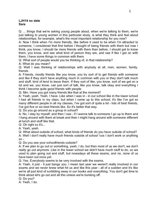 Anonymised transcript of an interview with Sara, who would like some sort of career in psychology or as a children's author. Sara has had quite a difficult time lately dealing with the pressures of being a teenager, finishing school and juggling different friendships. Friendship is quite important to her, and she goes into a fair amount of detail about this. She seems to have difficulty trusting other people and this has crept into they way that she thinks about friendships and romantic relationships. Sex education at Sara's school has been very basic and functional and she would have liked more on the emotional aspects and for it to be taught by younger teachers. She has learnt more through the media. Her parents do not allow any sort of talk about sex in the house, whether on the TV or in romantic novels, and her mother has some homophobic views. Sara has tried not to let this influence her, but does reflect on her Muslim upbringing - she will have an arranged marriage, for instance. She is adamant on using condoms in the future, but understands that it can be difficult for young women to navigate this in heterosexual relationships. Her and her friends seem to have lots of open conversations around things like pleasure and consent, and Sara comes across as fairly confident in her understanding of sex and relationships.