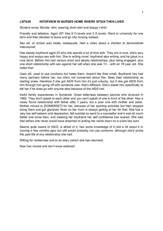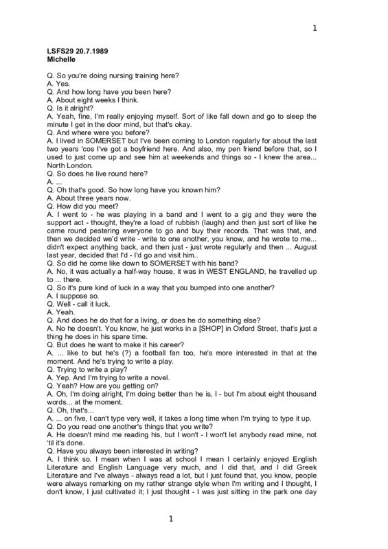 LSFS29 20.7.1989 Michelle Q. So you're doing nursing training here? A. Yes. Q. And how long have you been here? A. About eight weeks I think. Q. Is it alright? A. Yeah, fine, I'm really enjoying myself. Sort of like fall down and go to sleep the minute I get in the door mind, but that's okay. Q. And where were you before? A. I lived in SOMERSET but I've been coming to London regularly for about the last two years 'cos I've got a boyfriend here. And also, my pen friend before that, so I used to just come up and see him at weekends and things so - I knew the area... North London. Q. So does he live round here? A. ... Q. Oh that's good. So how long have you known him? A. About three years now. Q. How did you meet? A. I went to - he was playing in a band and I went to a gig and they were the support act - thought, they're a load of rubbish (laugh) and then just sort of like he came round pestering everyone to go and buy their records. That was that, and then we decided we'd write - write to one another, you know, and he wrote to me... didn't expect anything back, and then just - just wrote regularly and then ... August last year, decided that I'd - I'd go and visit him.. Q. So did he come like down to SOMERSET with his band? A. No, it was actually a half-way house, it was in WEST ENGLAND, he travelled up to ... there. Q. So it's pure kind of luck in a way that you bumped into one another? A. I suppose so. Q. Well - call it luck. A. Yeah. Q. And does he do that for a living, or does he do something else? A. No he doesn't. You know, he just works in a [SHOP] in Oxford Street, that's just a thing he does in his spare time. Q. But does he want to make it his career? A. ... like to but he's (?) a football fan too, he's more interested in that at the moment. And he's trying to write a play. Q. Trying to write a play? A. Yep. And I'm trying to write a novel. Q. Yeah? How are you getting on? A. Oh, I'm doing alright, I'm doing better than he is, I - but I'm about eight thousand words... at the moment. Q. Oh, that's... A. ... on five, I can't type very well, it takes a long time when I'm trying to type it up. Q. Do you read one another's things that you write? A. He doesn't mind me reading his, but I won't - I won't let anybody read mine, not ‘til it's done. Q. Have you always been interested in writing? A. I think so. I mean when I was at school I mean I certainly enjoyed English Literature and English Language very much, and I did that, and I did Greek Literature and I've always - always read a lot, but I just found that, you know, people were always remarking on my rather strange style when I'm writing and I thought, I don't know, I just cultivated it; I just thought - I was just sitting in the park one day 1 2 about four months ago and I thought, I know, why don't I just write about things that come into my head, and I just started writing things down, it just came from that. Q. Sounds great. Why did you decide to be a nurse? I noticed you said you went to [UNIVERSITY IN WEST MIDLANDS] for a term. A. Yeah. I don't know, it was nothing that I'd ever thought - you know, when I was small, I want to grow up and be a nurse, nothing like that, it was just what - as soon as I'd left university it was, what do I do now? And I was working in a supermarket... dreadful, I didn't think I'd do that, I thought well, what can I do? And I just thought, well, nursing can be a springboard to anything really, and it was - it was another qualification to get under your belt, and I thought - ... it would make me as a person a lot stronger, I thought it would really build me up, make me be able to cope with things better and make me a stronger person, just help me deal with life better. I don't know - I don't sort of like - I know that I want to do mental nursing afterwards 'cos I'm more interested in that side, more than dishing out drugs and things, I don't - I don't think I want to be a ward sister, I want to maybe go out as a health visitor or something, I want to be out with people. But I can't really say why I went into nursing, I just thought - once you've done it you can really - you're not - you're not trapped, there's so many different directions you can take. You know, that's what appealed to me. 'Cos I had no idea what I wanted to do with my degree once I'd finished if I was at university. Q. Is that why you left? A. No, I mean I was enjoying the course, it was fine, I hated it in [CITY] - I didn't like the other students really. I - I went for the wrong reason, I think, I ran away from home to go to university, the first place that would accept me I just went there because I was just so desperate to leave home. It was just completely the wrong reason to go, I didn't go there for the course or anything, just so that I could leave home, and it didn't work out, you know. Q. So what had it been like at home? A. Oh, my parents have been divorced since about '82 and there was a lot of bad feeling, you couldn't mention my dad's name around my mum, I hadn't seen my dad at all, I only recently started seeing him about - about three months ago, after seven years... and that really upset my mum, you know... but anyway, building up a relationship with my dad and we're just getting on so well, it's like, it's two strangers met, you know, 'cos the last time I saw him I was twelve, I was a completely different person. And that's getting on really well and since I've been away I find that I'm getting on with my mum better, she was just very bitter about it all and - you just - it's a bit funny 'cos you can't sort of like mention one or the other in each other's company, you know, everybody gets upset. It's just very messy and very angry and - we moved away and went, my mum went into a [SHOP] and she's very miserable all the time, and we moved away... my fault, we'd moved away 'cos I came here to do my - my sporting activities and my swimming and then when I came here I didn't do them. So Q. What were your sporting acti