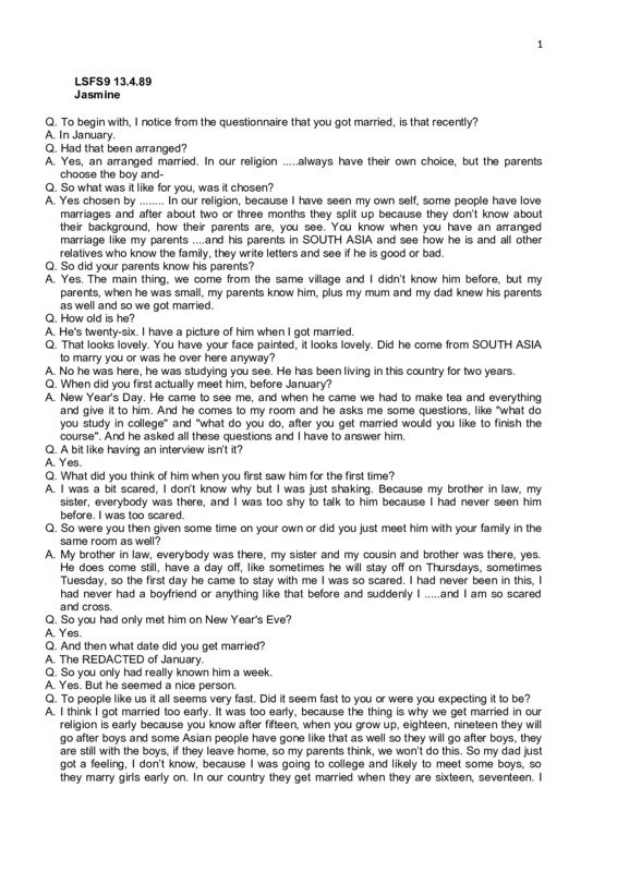 LSFS9 13.4.89 Jasmine Q. To begin with, I notice from the questionnaire that you got married, is that recently? A. In January. Q. Had that been arranged? A. Yes, an arranged married. In our religion .....always have their own choice, but the parents choose the boy andQ. So what was it like for you, was it chosen? A. Yes chosen by ........ In our religion, because I have seen my own self, some people have love marriages and after about two or three months they split up because they don’t know about their background, how their parents are, you see. You know when you have an arranged marriage like my parents ....and his parents in SOUTH ASIA and see how he is and all other relatives who know the family, they write letters and see if he is good or bad. Q. So did your parents know his parents? A. Yes. The main thing, we come from the same village and I didn’t know him before, but my parents, when he was small, my parents know him, plus my mum and my dad knew his parents as well and so we got married. Q. How old is he? A. He's twenty-six. I have a picture of him when I got married. Q. That looks lovely. You have your face painted, it looks lovely. Did he come from SOUTH ASIA to marry you or was he over here anyway? A. No he was here, he was studying you see. He has been living in this country for two years. Q. When did you first actually meet him, before January? A. New Year's Day. He came to see me, and when he came we had to make tea and everything and give it to him. And he comes to my room and he asks me some questions, like "what do you study in college" and "what do you do, after you get married would you like to finish the course". And he asked all these questions and I have to answer him. Q. A bit like having an interview isn’t it? A. Yes. Q. What did you think of him when you first saw him for the first time? A. I was a bit scared, I don’t know why but I was just shaking. Because my brother in law, my sister, everybody was there, and I was too shy to talk to him because I had never seen him before. I was too scared. Q. So were you then given some time on your own or did you just meet him with your family in the same room as well? A. My brother in law, everybody was there, my sister and my cousin and brother was there, yes. He does come still, have a day off, like sometimes he will stay off on Thursdays, sometimes Tuesday, so the first day he came to stay with me I was so scared. I had never been in this, I had never had a boyfriend or anything like that before and suddenly I .....and I am so scared and cross. Q. So you had only met him on New Year's Eve? A. Yes. Q. And then what date did you get married? A. The REDACTED of January. Q. So you only had really known him a week. A. Yes. But he seemed a nice person. Q. To people like us it all seems very fast. Did it seem fast to you or were you expecting it to be? A. I think I got married too early. It was too early, because the thing is why we get married in our religion is early because you know after fifteen, when you grow up, eighteen, nineteen they will go after boys and some Asian people have gone like that as well so they will go after boys, they are still with the boys, if they leave home, so my parents think, we won’t do this. So my dad just got a feeling, I don’t know, because I was going to college and likely to meet some boys, so they marry girls early on. In our country they get married when they are sixteen, seventeen. I 2 got married when I was eighteen. My sister got married when she was eighteen. She got married last year. Q. And is she happy? A. Yes, she is happy. She had an arranged marriage as well. Q. What were you going to say about how strange it was when he comes to visit? A. On the first night when he came, I was so scared to let him come in my bed. Q. What did you do? A. I was screaming. My parents were downstairs, because at the moment I am staying in my parent's house, because I can’t go and stay with him because he hasn’t got any relations in this country so only his sister came to London in February just after we were married, just after one month, so she did and she changed her mind. Because after an Asian wedding you have a big party, so we still haven’t done that, so we are going to do this. Q. So that’s still to come? A. Yes. So that will be next month. So we will do that party and then I am going to stay with him in his house, buy a house or rent a flat or something like that. Q. What does he live in at the moment? A. He lives in a restaurant, two brothers in a restaurant over the restaurant. Q. So you can’t go and live with him there? A. No. He will come to my house and stay. Q. Which is what he does? A. Yes. Q. So were you just scared of sex? A. Yes, I was scared of sex because before I didn’t know anything about taking tablets and things. Q. You mean the pill? A. Yes, because we never talk to our parents and I am too shy and in school we used to watch sex and all this. Q. They gave you videos? A. And I was scared so I never used to watch it you see. Q. So you didn’t even watch it at school? A. Not at school and I didn’t know anything about it you see. So I didn’t know what to do and I thought if he does it now I am so scared I might be pregnant. I won’t let him to do it. So he had to say don’t be scared, it’s nothing and all this, and I still won’t let him do it. I will scream. And then he told me he was going to use Durex, and he used that and after one week he used that and then because he doesn’t like it, and then he told me everything. He said, "you should go to the doctors, and I will come with you and get the pills". Since then I am on pills. Q. So you are taking the pill? A. When I am taking the pill I'm alright because then I know I'm not going to get pregnant. Because I am really scared to be pregnant because my brother in law said if you get pregnant now, I am going to kill you because.... a baby still - he was just joking. You are a bit too young to h