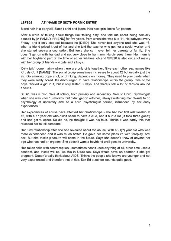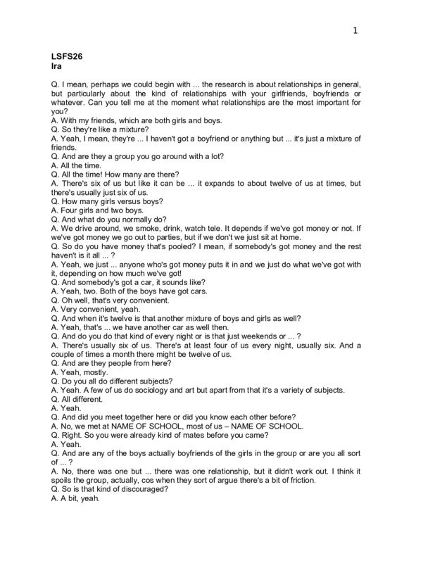 LSFS26 Ira Q. I mean, perhaps we could begin with ... the research is about relationships in general, but particularly about the kind of relationships with your girlfriends, boyfriends or whatever. Can you tell me at the moment what relationships are the most important for you? A. With my friends, which are both girls and boys. Q. So they're like a mixture? A. Yeah, I mean, they're ... I haven't got a boyfriend or anything but ... it's just a mixture of friends. Q. And are they a group you go around with a lot? A. All the time. Q. All the time! How many are there? A. There's six of us but like it can be ... it expands to about twelve of us at times, but there's usually just six of us. Q. How many girls versus boys? A. Four girls and two boys. Q. And what do you normally do? A. We drive around, we smoke, drink, watch tele. It depends if we've got money or not. If we've got money we go out to parties, but if we don't we just sit at home. Q. So do you have money that's pooled? I mean, if somebody's got money and the rest haven't is it all ... ? A. Yeah, we just ... anyone who's got money puts it in and we just do what we've got with it, depending on how much we've got! Q. And somebody's got a car, it sounds like? A. Yeah, two. Both of the boys have got cars. Q. Oh well, that's very convenient. A. Very convenient, yeah. Q. And when it's twelve is that another mixture of boys and girls as well? A. Yeah, that's ... we have another car as well then. Q. And do you do that kind of every night or is that just weekends or ... ? A. There's usually six of us. There's at least four of us every night, usually six. And a couple of times a month there might be twelve of us. Q. And are they people from here? A. Yeah, mostly. Q. Do you all do different subjects? A. Yeah. A few of us do sociology and art but apart from that it's a variety of subjects. Q. All different. A. Yeah. Q. And did you meet together here or did you know each other before? A. No, we met at NAME OF SCHOOL, most of us – NAME OF SCHOOL. Q. Right. So you were already kind of mates before you came? A. Yeah. Q. And are any of the boys actually boyfriends of the girls in the group or are you all sort of ... ? A. No, there was one but ... there was one relationship, but it didn't work out. I think it spoils the group, actually, cos when they sort of argue there's a bit of friction. Q. So is that kind of discouraged? A. A bit, yeah. 2 Q. Cos that must be a bit awkward if somebody actually fancies one of the boys that is in the group but would feel a bit nervous perhaps of going out with them? A. I think it's one of the boys that fancies one of the girls and ... Q. What, at the moment? A. Yeah, and it's a bit difficult at times. Q. But would she feel ... I mean, was it you? A. No, it's not me! Q. Would she feel sort of embarrassed about that, that it might sort of split up the group if she did go and ... ? A. Well, she went out with him for like three days and it didn't work and there's still a bit of sort of friction. Q. Right, so it's stopped now? A. Yeah, but like, he still fancies her and it's really obvious. It's just a bit embarrassing at times. Q. I can imagine. But it hasn't stopped you both ... them both, I mean, being in the group. A. Oh no, no, no. Not at all. Q. And do you go to pubs a lot? A. Not lately, but yeah, we used to go much more than we do now. We used to go about ... we sometimes used to go every night. But now it's a couple of times a month. Q. Why’s that? A. We haven't got the money and we tend to smoke more now. Q. What, smoke dope? A. Yeah. Q. But that costs money too? A. Yeah, I know, but in the long run it's cheaper. We only need to have five pounds a night for all of us. You know, it's cheaper. Q. And does somebody get it for you or ... ? A. No, we buy it, well, we know loads of people that sell it so we just ... Q. So does that mean you've stopped drinking and you're now smoking? A. Yeah, yeah. Q. Did you drink alcohol before or was it just other sorts? A. Yeah, beer and spirits mainly, yeah. Q. What, in pubs? A. Yeah. Q. Were you over age then? A. No, I was underage. Q. But was that alright? You didn't get questioned or anything? A. No, I mean, I don't look my age and I'm now old enough. I'm eighteen now. But I have been drinking in pubs since I was fourteen and I've never been asked my age. I just don't think they bother. Q. So, do you find smoking better than drinking? A. Yeah. Q. Why? A. Drinking you usually, I mean, usually you have to go to a pub or something ... I don't know. I don't really like the feeling of being drunk all that much. I used to when I was younger but not so much now. I prefer the feeling of being stoned now. Q. How would you describe being stoned, for you? A. Just get in a really silly mood and just talk rubbish and, I don't know, you talk ... we have the most dirtiest conversations when we're stoned. Q. What, about sex? A. Yeah, it's our favourite topic. 3 Q. What do you talk about? A. Oh, just about ... just about the most disgusting things and things like that. Well, we might bring perfectly normal sexual things and make them sound really disgusting and then see who can make up the most disgusting sentence. Something like that. Q. What is disgusting? A. Like a boy putting his prick in your mouth or something like that. Q. And who talks about that? You all do, or is it the boys who talk about putting pricks in girls' mouths? Or do you all talk about it? A. No, we tend to talk about this when it's just the four girls. Q. Right, so you don't talk the dirty talk when the boys are around? A. Not really, we might come out with a few comments, but we don't have a really good conversation about it. Q. Do you like it? A. Yeah, it a laugh, yeah. Q. But is that how you normally think about those things or is it just pissing about because you're a bit stoned? A. Um, yeah, I think it is how we think of ... how I think about those things to a certain extent. Q. Cos what are the most awful and di