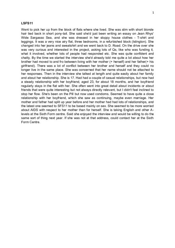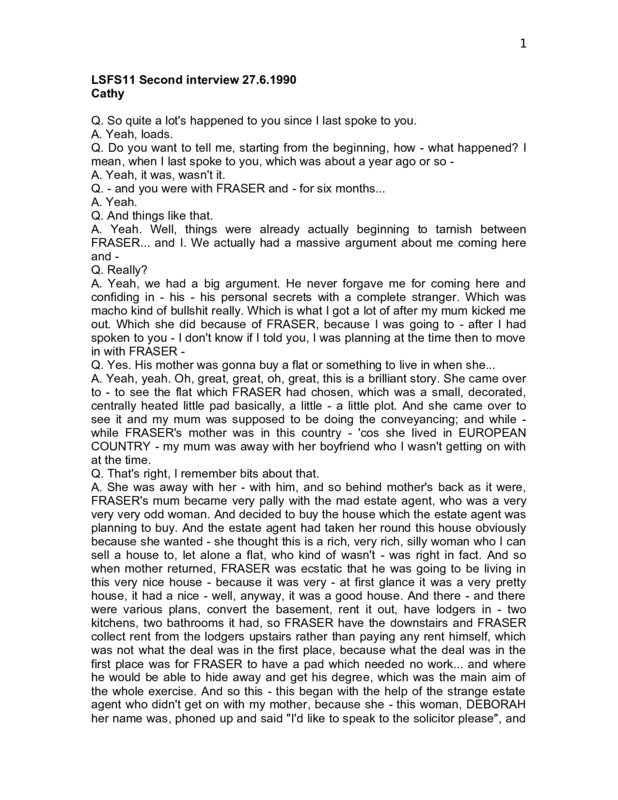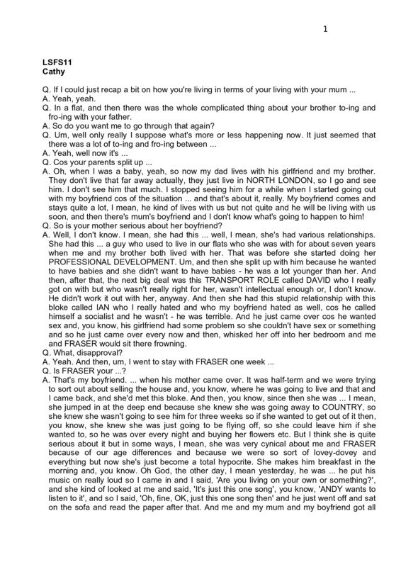 LSFS11 Cathy Q. If I could just recap a bit on how you're living in terms of your living with your mum ... A. Yeah, yeah. Q. In a flat, and then there was the whole complicated thing about your brother to-ing and fro-ing with your father. A. So do you want me to go through that again? Q. Um, well only really I suppose what's more or less happening now. It just seemed that there was a lot of to-ing and fro-ing between ... A. Yeah, well now it's ... Q. Cos your parents split up ... A. Oh, when I was a baby, yeah, so now my dad lives with his girlfriend and my brother. They don't live that far away actually, they just live in NORTH LONDON, so I go and see him. I don't see him that much. I stopped seeing him for a while when I started going out with my boyfriend cos of the situation ... and that's about it, really. My boyfriend comes and stays quite a lot, I mean, he kind of lives with us but not quite and he will be living with us soon, and then there's mum's boyfriend and I don't know what's going to happen to him! Q. So is your mother serious about her boyfriend? A. Well, I don't know. I mean, she had this ... well, I mean, she's had various relationships. She had this ... a guy who used to live in our flats who she was with for about seven years when me and my brother both lived with her. That was before she started doing her PROFESSIONAL DEVELOPMENT. Um, and then she split up with him because he wanted to have babies and she didn't want to have babies - he was a lot younger than her. And then, after that, the next big deal was this TRANSPORT ROLE called DAVID who I really got on with but who wasn't really right for her, wasn't intellectual enough or, I don't know. He didn't work it out with her, anyway. And then she had this stupid relationship with this bloke called IAN who I really hated and who my boyfriend hated as well, cos he called himself a socialist and he wasn't - he was terrible. And he just came over cos he wanted sex and, you know, his girlfriend had some problem so she couldn't have sex or something and so he just came over every now and then, whisked her off into her bedroom and me and FRASER would sit there frowning. Q. What, disapproval? A. Yeah. And then, um, I went to stay with FRASER one week ... Q. Is FRASER your ...? A. That's my boyfriend. ... when his mother came over. It was half-term and we were trying to sort out about selling the house and, you know, where he was going to live and that and I came back, and she'd met this bloke. And then, you know, since then she was ... I mean, she jumped in at the deep end because she knew she was going away to COUNTRY, so she knew she wasn't going to see him for three weeks so if she wanted to get out of it then, you know, she knew she was just going to be flying off, so she could leave him if she wanted to, so he was over every night and buying her flowers etc. But I think she is quite serious about it but in some ways, I mean, she was very cynical about me and FRASER because of our age differences and because we were so sort of lovey-dovey and everything but now she's just become a total hypocrite. She makes him breakfast in the morning and, you know. Oh God, the other day, I mean yesterday, he was ... he put his music on really loud so I came in and I said, 'Are you living on your own or something?', and she kind of looked at me and said, 'It's just this one song', you know, 'ANDY wants to listen to it', and so I said, 'Oh, fine, OK, just this one song then' and he just went off and sat on the sofa and read the paper after that. And me and my mum and my boyfriend got all 2 the breakfast ready - had a big fry-up and everything. We laid the table and he didn't even offer to help, you know, he didn't even offer to do anything. He just sat there and read the paper. And you know, after the meal my boyfriend did all the clearing up and put everything in the dishwasher and there was just not a word from him. And she doesn't seem to mind at all so ... Q. And is that what he's like in general? A. I don't know. He was married for twenty-five years so ... and his ... you know, he had two sons and was very much, you know, he was the breadwinner and his wife was the housewife and he can't cook at all or anything. She always did everything for him and now he says, you know, he says his views have changed but I ... Q. There no sign of it. A. No, I find it hard to believe and I don't know about his politics either - I think they're a bit suspect but the thing was, my mum was so lonely with just ... I mean, she really was getting dependent on me which was something I didn't like at all because I was ... I had my relationship with FRASER and I was thinking of, you know, what I was going to do, where I was going to go to university, where I was going to live and I didn't want to have to think about, 'Oh God, is she going to be alright on her own?' and everything. So, I mean, when she found IAN then I was pleased for her in a way, but it does seem to be a very sexual relationship - it just seems to be based on sex. I hate to say it, but it seems like they're making a last stand before they both become celibate in their old age. Q. Terrible sort of future ... A. It's like, they make so much noise and they have to, you know, 'We're going to the bedroom now', and you know, rush off and grunting and groaning. Q. What, they're not embarrassed about that in front of you and FRASER or ...? A. No, I mean ... well, they just ... it's like they're trying to prove something, I don't know. I mean, I know I'm obviously exaggerating it because I'm a bit pissed off with her at the moment, but I don't know what's going to happen once it gets to be a long-term thing, whether it's going to survive or not. Q. How long have you been with FRASER? A. I've been with FRASER since ... it's a year and a half, just over a year and a half now. So we met when I was fifteen and he was twenty-one. Q. How did you meet? A. Oh, in a nightclub, in the Town and Country Club. 