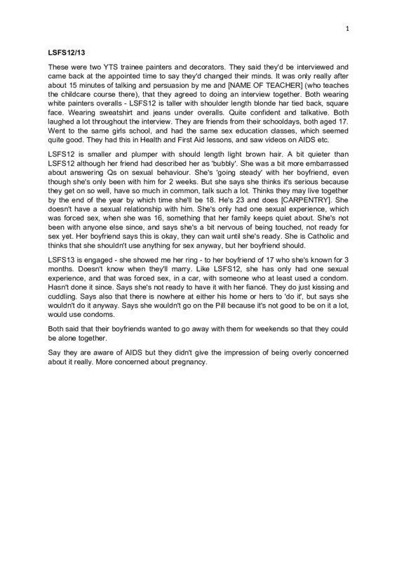LSFS1213 20.4.89 Laura and Rachel Q. I notice from the questionnaires that you both filled in that you seem to have had a lot of sex education at school, and I know from what you have just said that you both went to the same school. Did they put in special lessons and things like that? A1. It was all different groups because there were 70 of us. A2. Yes, we had, like, different lessons. Like, one had a sex education group in the afternoon and one in the morning, or before we went home or something like that. A1. There was so many of us there were seven groups. Q. How big were the groups? A1. There was about seven in each, I think. A2. No, there was more in one than the other. We had about seven in ours, but you must have had more than that in your group? A1. Yes, but they didn’t turn up. A2. Most of them bunked off. Q. Why did they bunk off? A2. Because they didn’t want to know anything about it. There were one or two who watched the video about some lady having a baby, one of them walked out and puked up everywhere, and the other one goes "I am having no kids, I can’t stand that, I won’t be able to do that", and we were going "will you shut up please", and all that, I was really getting into it. Q. Did you two go along to them then, you didn’t bunk off? A1. Yes. A2. Yes. Q. Were they useful? A1. Yes. A2. They were useful, they were quite funny as it goes. Q. And was it an all girl’s school? A2. Yes. Q. So there weren’t any boys to? A2. There were boys there, but they were sixth formers. We didn’t really have many boys in there. Q. And they didn’t come to your sex education classes? A1. No. A2. No. I don’t think they would. But it was alright, it was quite a laugh. Q. And was it specifically sex education or did they include it in biology or health education or something like that? A1. They included it in health and first aid, child development- 2 A2. And what to do with a heart attack and that sort of stuff. Q. And could you ask questions if you wanted to, was it that sort of atmosphere? A1. Yes. A2. Yes. Q. And had you known about most of it before or was it new to you at school? A1. Most of it we knew. A2. I knew most of it from at home because my mum used to tell me about it. And I used to sit and ask her questions, she would sit there and say to me, "do you want me to be straightforward to you" and I goes "yes" and she was sat there telling me all about it, about the birds and bees, and it was alright. And when we got to school the teachers would ask questions and they all used to sit there going, and my hand would go up and say it’s this and that, and she said '"well, you know a lot about it". Q. Did you want to give the lessons? A2. Yes, and she would be looking at me and going like that and she asked about contraception and what kind of contraceptives do you have, and I stuck my hand up going we've got this and that, and the teacher just looked at me and just going, how does she know all this. I did know it all, but it was alright. Q. How old were you then? A2. It was in the third year. A1. The third year, yes. A2. I suppose we were about thirteen, fourteen. A1. Fourteen, then we had it for an exam as well. Q. What, in the health and first aid? A2. Yes, we used to have it in the health and first aid and child development. Q. What do they include in that? Do you mean contraception or other things? A1. It was all of it. A2. Like transmitted diseases and contraception and boys and parts of the male body and parts of the female body, and all this. A1. We learned that in the fifth year, with more like heart attacks and what would you do if this happened, about fits as well. In the third year we did contraception, but when it got to fifth year we were doing things like heart attacks, etc. A2. We saved a little girls life, didn’t we. My next door neighbour's daughter. She had a fit and I didn’t know what I was doing, I was shaking because I had never done anything like that before and she was put on her side and took her head back and stuck her tongue out of her mouth and things like that. Because she was going purple wasn’t she, she couldn’t breathe or nothing. Q. It must have been frightening. 3 A2. And she woke up and she started crying, and I go, “are you going to hit NAME OF NEIGHBOUR now”, and she was going “yes”. But she is alright now. Because she had the flu and ....she had a fit ..... Q. That was lucky you had seen it. A2. Yes, the next door neighbour was banging on the door ......and I was crying and I went to LAURA, "what am I doing, what am I doing", you know, I was running up the stairs, my dog was going berserk, I was running round the house like a stupid idiot, getting cold flannels and everything. Q. And did they teach you about AIDS in those sort of lessons? A1. Yes. A2. Yes, they did. Q. What a lot, what sort of things? A2. How it was transmitted and what you use to protect yourself. A1. And she showed us videos, etc. What was it called? It was a programme about AIDS. Q. That was on the television? A1. Yes, and they were talking about it and she put that on and we listened to it. A2. ..... A1. And we asked questions after. Q. And did everyone have that or was that just if you were taking your health and first aid? A1. They showed everyone it because there were all different teachers in different groups. A2. The girls in our school started quite young, didn’t they. There was a fourteenyear old girl pregnant, and one of the pupils in our school was going out with one of the teachers up there. Q. Really? A2. Yes, he said I will never go out with a pupil in this school and the next thing "Oh do you know Mr. so and so is going out with so and so", and you think bloody hell, he didn’t waste any time. Q. Both of you seem to be going steady or engaged is that right? A1. I am engaged. Q. You are engaged? A2. I'm going steady. Q. You are going steady, so how long have you been with your…? A2. I have been with my boyfriend for two week