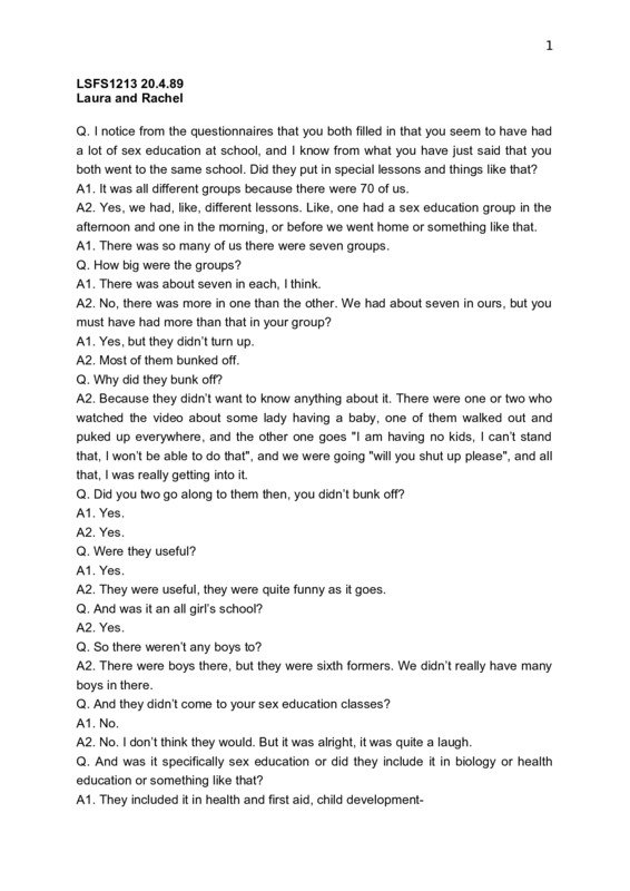 Interview with Laura and Rachel. Laura is 16-17, White British, working class, Roman Catholic and Rachel is 16-17, White British, upper working class, no religion. Women, Risk and AIDS Project, London, 1989. Anonymised version including field notes. (Ref: LSFS1213)