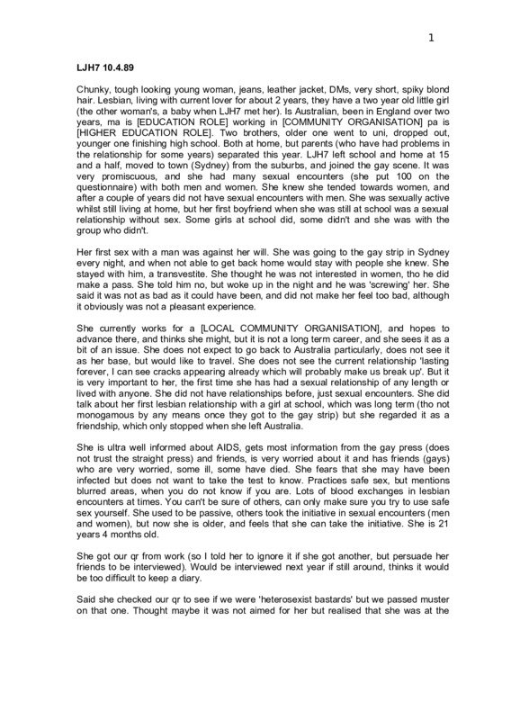 LJH7 10.4.89 Justine Q. One of the things that we are really interested in in this research, is to find out how people feel and what they think about their relationships, so I'd like to ask you, what's the most important relationship that you have, or relationships? A. At the moment? I'm in one relationship and I have been for two years now ... with a woman. Q. And that's the most important ...? A. That's it. Q. What's the most important thing about that relationship for you? A. Um, it's the first stable relationship I've had, well the first sort of long-term thing, um, so that's quite important. It's the first time I've lived with someone and had a relationship with them. Um, ... Q. I'm just trying to think what would be ... Yeah. What other sorts of things do you value about it? A. It's very close and I think the main thing is that I'm living with somebody who I'm in a relationship with, it's a, it's a very different ... set-up to ... you know, when you're not living with someone. I think that's sort of the main ... Q. Have you been living with her the whole time? A. Yeah, nearly. Q. You decided straight away that that’s the way you wanted it? A. We met and saw each other constantly for a few months and then went out and got a flat together. Q. Mm. A. So basically, it's been living together from the start. Q. Mm. What does she do? A. She's unemployed at the moment. We've got a child and she spends most of her time looking after the child. Q. Mm. How ...? She had the child before ...? A. Yeah. Q. Yeah. Because I know ... A. Just before we met. She was a baby when I met her. Q. Mm. How do you get on with the child? A. Oh, very well. I'm sort of like the co-parent. Q. Yeah. A. But, um, she's a lot of effort, the child, but we get on quite well, I think. It's a good relationship. Q. Mm. What sort of other relationships did you have before then? You say you didn't live with anyone? A. They were all short and all just basically sex. Men and women. Um, and a lot of them. Q. Yeah, I noticed that from the questionnaire. A. Um, I never really had a relationship. There was nothing I would call ... a total relationship - it would be the one thing or another. Mainly, you know, very brief. Q. How did you feel about that? Did you ... ? 2 A. At the time it was, it was what was happening, you know, it just happened. I was out on the gay scene, very young, in Sydney and it was very promiscuous ... Q. Mm. A. At the time. Everyone went to bed with everyone and I followed suit with that. Um, it was good at the time. Young, free and ... Q. Yeah. A. I just never got very attached to anyone. Q. How young were you when you ... ? A. About, sort of, fourteen going on fifteen, I sort of hit the gay scene. Q. Mm. How did you, how did you decide that you were gay? A. Well, I didn't, I hadn't at that stage. I was, sort of ... I knew I liked women, so I started sort of mixing with people who were gay and, I just took it as it came. I liked gay clubs a lot more and I mean, I wasn't gay then, I was still sleeping with men and women - whatever came along that was good-looking. Q. Yeah. A. Um, I didn't really decide until years later when I realised I only liked women. But at the time it was nothing really, nothing major about it, because I knew lots of people and it seemed quite natural. Q. Mm. Yeah. So, it was when you first started ...? Was your first sexual relationship, was that gay or with a ... ? A. It's sort of hard because they overlapped a little bit. Um, I guess you could say the first one was with a man but the first person I had sex with was with a woman. Q. Ah. Yeah. A. And so, I mean, I had a boyfriend at school - it was a sexual relationship, but we never had sex. Q. Yeah. A. But then I sort of went home with a woman on a one-night stand - that was the first time. Q. Mm. I'm interested in what you say about having a sexual relationship with a boyfriend, but it didn't involve sex. You engaged in other sorts of sexual activities but not ... ? A. Yeah. It was because I was quite young - it was a lot of kissing and groping and sort of everything basically, except sex. I was sort of young and at home, with my parents, not having any form of contraception, still wondering whether to wait until I get married, type of thing, and so nothing happened ... nothing much. Q. Yeah. What about ... ? Did you, were you concerned about contraception when you were going through this period of sleeping with lots of people? A. Yeah. I was very, very determined not to get pregnant. I always made sure, except for a couple of times. Two times when one thing or another happened ... Q. What sort of things ... ? A. I was mostly on the pill and when that failed I had some … Q. What about the condom, would you, did you use that ever? A. I think I only used that a couple of times, not with much success, because, you know, it was a real bastard of a partner who I was with at that moment. And that was one of the times when I accidentally had unprotected sex. Um, that just didn't work because I couldn't get people to cooperate with it - it was just a real pain. 3 Q. Mm. Yes. A. And it was a lot more visible than the pill so, you know, the only way I could be sure was with the pill. Q. Mm. Yeah. What about, um, sexually transmitted diseases or other sorts of thing? Were you worried about that at all? A. I got a couple. Q. You did? A. But I was not worried really at the time. I mean, it was easy to go to the V.D. clinic and get cleared up, you know. I really wasn't too bothered. I never sort of worried about that barrier thing, like of having barrier form of contraception. As long as I wasn't pregnant, I was happy, at the time. I think this was still slightly before AIDS really came up as an issue in Australia. Q. Mm. A. Like, looking back ... it was very still very promiscuous. Q. Yeah. How old were you when you sort of decided that it was women for you? A. Um ... It's really hard because there wasn't a definite sort of time. It was ..
