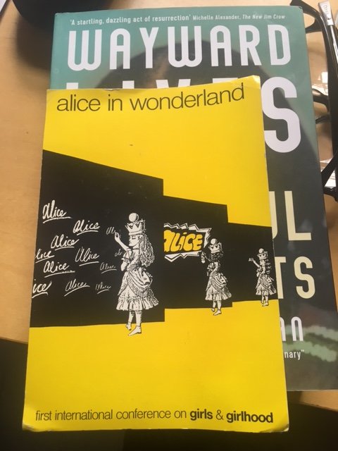 Photograph of post card from 1992 conference 'Alice in Wonderland - the first international conference on girls and girlhood' held in Amsterdam (which I attended with the WRAP team), sitting on the 2019 book 'Wayward lives and beautiful experiments' by Saidiya Hartman - which I just read and loved. 25 years of amazing feminist research, making the lives of girls visible and celebrating their creativity. The work continues