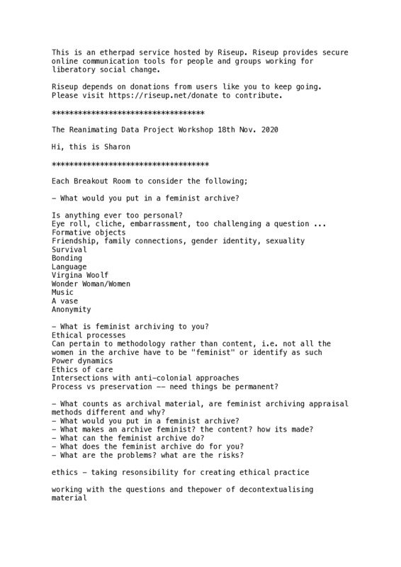 online communication tools for people and groups working for liberatory social change. Riseup depends on donations from users like you to keep going. Please visit https://riseup.net/donate to contribute. *********************************** The Reanimating Data Project Workshop 18th Nov. 2020 Hi, this is Sharon ************************************ Each Breakout Room to consider the following; - What would you put in a feminist archive? Is anything ever too personal? Eye roll, cliche, embarrassment, too challenging a question ... Formative objects Friendship, family connections, gender identity, sexuality Survival Bonding Language Virgina Woolf Wonder Woman/Women Music A vase Anonymity - What is feminist archiving to you? Ethical processes Can pertain to methodology rather than content, i.e. not all the women in the archive have to be "feminist" or identify as such Power dynamics Ethics of care Intersections with anti-colonial approaches Process vs preservation -- need things be permanent? - What counts as archival material, are feminist archiving appraisal methods different and why? - What would you put in a feminist archive? - What makes an archive feminist? the content? how its made? - What can the feminist archive do? - What does the feminist archive do for you? - What are the problems? what are the risks? ethics - taking resonsibility for creating ethical practice working with the questions and thepower of decontextualising material listening Finding, being found, renwing tensions between safe spaces and public spaces/ open spaces letting something unexpected happen. we don't know what feministknowledge making will look like when we share the archive. questions can be more revraling than answers. past-present relations rather than then and now collect, but how to use.creatively. do we want to do more than preserve and hoard the histories as part of dealing with trauma rather than unleashing it. Methods for getting beneath narrative, unexpected, lateral, Abira, Joan, Sharon What is feminist archiving to you? - recogniction of labour and appropriate pay - a particular approach, a process and a methology (how objects are selected, organised and described) - feminsit, queer, post-colonial, are we grappling with the same questions? - Causes disruptions - Melissa Adler, impact of lack of representation, what you can add to something that already exists rather then creating something new. - "The politics of seeing" - Heidi (Museum, objects, lessons) - feminsist organising - portable archives, building community (creative archiving) Climbling Poetree - disrupts the notion of "the" archive, broadening the parameters of the archive - the digital does this - relationship between museums and arhives, how things are accessed digitally changes this. The digital replicates. - Michelle Caswell, imagined archives. When "silenced" or absent. - archives feel fixed, feminist archives are more fluid - forming connections between the past, not being bound by time or space. Liberation - Activism - creating genealogies, activiating others to connect to history - Story-telling and creative aspects - the buidling of the archive is just the beginning of the story - creative reponses activate different responses *********************************** Key Concepts on feminst archiving (RAD Team and You) Suzanne, Ali, Niamh - the importance of trying to capture all contributions to archival work - women's archival labour can be overlooked - the significance of scale - Moravec - on the British Library being able to digitise Spare Rib - but what is possible for small archives - the choices that get made - what gets digitised and made available - how are those decisions made - decolonisation the focus of conversations in the library - but library has inherited collection from Insitute of Development Studies - the significance of the location - where is the archive, what gets donated - who gets to make decisions in archives - smaller archives having more autonomy to gather materials maybe; also the role of the idiosyncratic archivist who may get to make decisions - the significance of the digital - archival material out of context? Ester, Janet and Eleanor Thinking about the literature on feminist ethics - recognising affect and power relations are key. the attention to affect really comes through in this project - the time and the thought and the care. This is not something that some funders of open data projects are interested in. So its really important to make this work visible. Thinking through what my children would think to hear my life? Brinign affect into history. What does it mean *not* to do the research, or not to make it available? We need to take some risks in order to do ethical research, thinking about the politics of representation. |