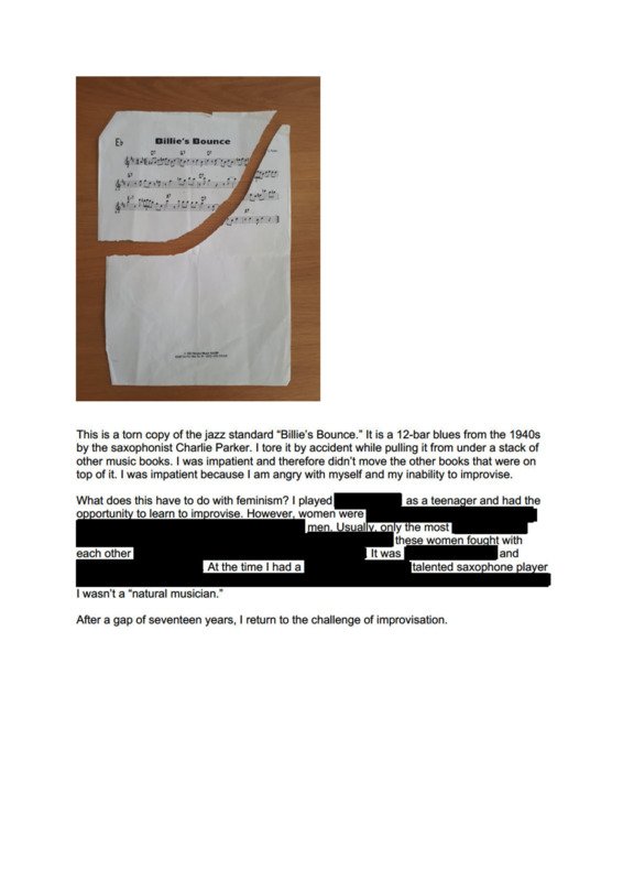 What does this have to do with feminism? I played [redacted] as a teenager and had the opportunity to learn to improvise. However, women were [redacted] men. Usually, only the most [redacted] these women fought with each other. It was [redacted] At the time I had a [redacted] talented saxophone player. I wasn’t a “natural musician.”