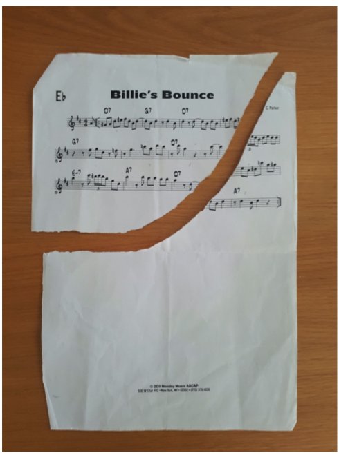 This is a torn copy of the jazz standard “Billie’s Bounce.” It is a 12-bar blues from the 1940s by the saxophonist Charlie Parker. I tore it by accident while pulling it from under a stack of other music books. I was impatient and therefore didn’t move the other books that were on top of it. I was impatient because I am angry with myself and my inability to improvise.