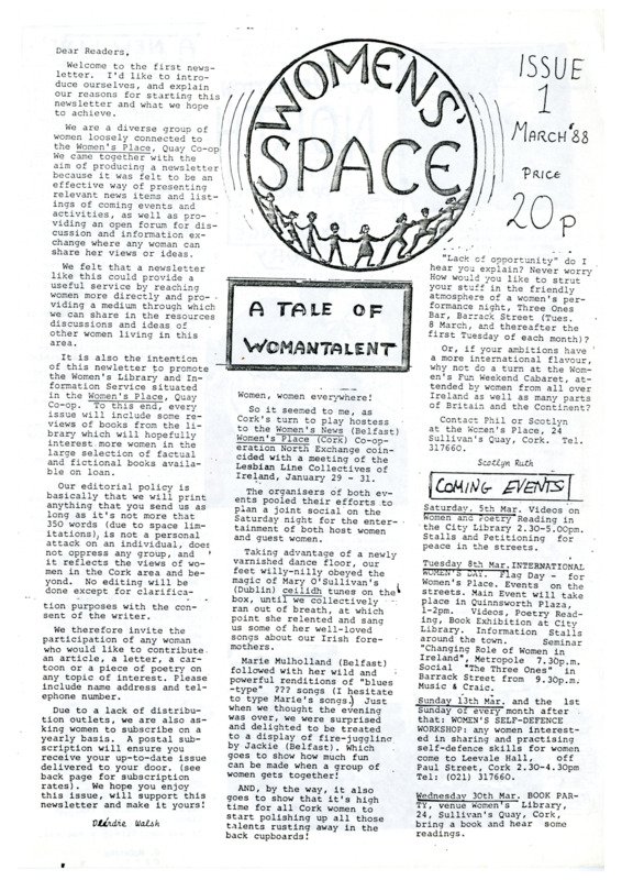 Women's Space Cork Newsletter Issue 1 March 88