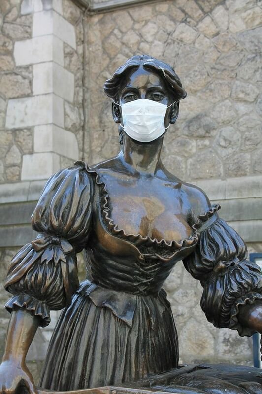 At the end of lockdown 1 of the Covid pandemic, when we were allowed to walk 5km, I wandered through the eerily empty city centre of Dublin. I encountered the familiar statue of Molly Malone festooned with a PPE mask. It spoke to me in 3 ways.
