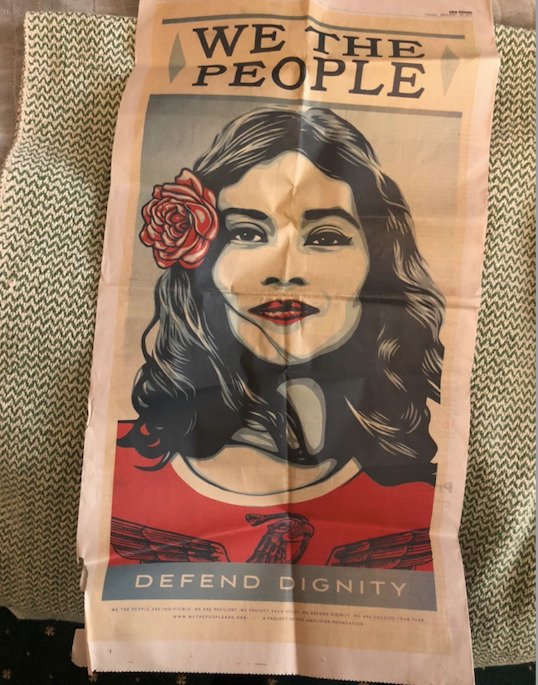 This is a poster created by Shepard Fairey that was printed in USA Today (American Newspaper) and disseminated for the purposes of the Women's March in January 2017. This is a second copy that I had - the other was taped to cardboard and carried at the Women's March in Oakland California as a response to the Election and inauguration of Donald Trump.