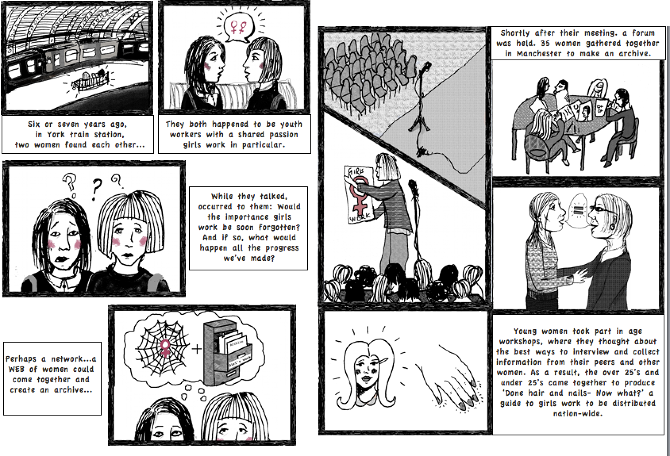 Feminist Webs is a women and girls work space that acts as an archive and a resource for practitioners, volunteers and young women involved in youth and community work with young women. Artist Hebe Phillips drew this illustration of the beginnings of Feminist Webs. It tells the story of two youth workers, feminists and academics, Alison Ronan and Jean Spence, meeting at a train station and imagining an archive of feminist youth work created by a web of feminist working together. Find out more about Feminist Webs here: https://www.feministwebs.com/