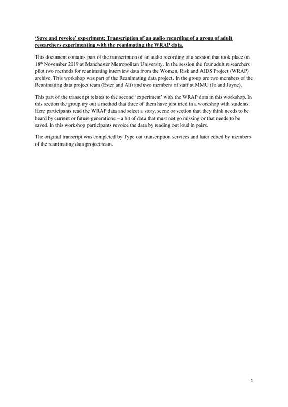 researchers experimenting with the reanimating the WRAP data. This document contains part of the transcription of an audio recording of a session that took place on 18th November 2019 at Manchester Metropolitan University. In the session the four adult researchers pilot two methods for reanimating interview data from the Women, Risk and AIDS Project (WRAP) archive. This workshop was part of the Reanimating data project. In the group are two members of the Reanimating data project team (Ester and Ali) and two members of staff at MMU (Jo and Jayne). This part of the transcript relates to the second ‘experiment’ with the WRAP data in this workshop. In this section the group try out a method that three of them have just tried in a workshop with students. Here participants read the WRAP data and select a story, scene or section that they think needs to be heard by current or future generations – a bit of data that must not go missing or that needs to be saved. In this workshop participants revoice the data by reading out loud in pairs. The original transcript was completed by Type out transcription services and later edited by members of the reanimating data project team. 1 1 2 3 4 5 6 7 8 9 10 11 12 13 14 15 16 17 18 19 20 21 22 23 24 25 26 27 28 29 30 31 32 33 34 35 36 37 38 39 40 41 42 43 44 45 46 47 Ester lays out data from two WRAP interviews on the table and messes the pages around. ESTER: Well, what we could do is one of the things that we just asked the students to do is we could look at…I’ll get another interview and then we can just choose which one we want to look at, and to cut out a bit of the woman’s story that we think needs to be heard. So we did something about missing discourses with the student group, and thinking, like, are there aspects of these women’s stories that feel really important to pass on or to be heard that we can put in the story pinata to be opened and shared with everybody at a public event? So we could just see if we could find a moment… JAYNE: Oh yes, I would quite like to do that. ESTER: Yes? That we don’t want to be missing. JAYNE: That’s important. ESTER: So one of the things we’ve been thinking about a lot is, like, how much data to give people because if we give too much, they’re overwhelmed, and that’s why these… I was just thinking of you and talking about how do you work with data, and I have found that being a bit…like choose one sheet of paper and work with that, and I suppose that’s one thing I’ve got from Rachel, really, in the work she’s been doing with a sound technician and working with sound is trying to work with the random and I think as a social scientist that’s a bit challenging, because it’s all about analysis, it’s about being systematic and methodological but if you just randomly take a page and do something with it, then that can be just as generative as trying to figure out some sort of thematic thing, and definitely in groups… I think once we started doing that, for me that was quite, like, liberating, because I think before that we were agonising over which ones to choose, which is the best one to choose, are we doing that thing of, like, well, there’s some Pakistani girls so we’ll choose the one Pakistani girl from the interview - but if you make it more random, I mean, there’s always an element of selection but then people just get on with doing it, and then you can kind of go from there, really. JAYNE: Stuff happens But let’s work with…speaking of being random…let’s work with these two, so we’ll leave that one on the table if you want to look at it, and I’ll get one more as well. I don’t quite know why I chose these today, these are two white working class women who work, and they’re actually a big part of the WRAP archive that we’ve not really been able to find equivalents of, and one of the things Rachel was telling the women’s theatre group that they were, like, oh, wow, and I will tell you today, was that in 1989 only ten per cent of people went to university, and now 50 per cent or more do, and the students in there were, like, woah, that idea that that was something that was a minority thing to do. So actually most young women who were aged 20, 21 were working, but now it’s hard to find young women who are full-time working at 20, 21 and involve them in a project like this, and they went through the unions and places like that to get… 2 48 49 50 51 52 53 54 55 56 57 58 59 60 61 62 63 64 65 66 67 68 69 70 71 72 73 74 75 76 77 78 79 80 81 82 83 84 85 86 87 88 89 90 91 92 93 94 95 S2: Well, the shocking thing today was the girl, the Iraqi girl who said I’m Iraqi, you know [NAME]?, she said she’s working in Amazon and she said it’s terrible, and I said, oh, are you allowed to be in a trade union? And she said, what’s that? And I said, you don’t know what a trade union is? She said, no, I’ve never heard of it, what is it? And I said, that’s for another time, really, but I said you need to google it and you need to get yourself in one. S1: That’s quite shocking. I’ll have to get it into the unit for the next couple of weeks. That’s really bad to not know. S2: Well, why would you? I mean, Amazon wouldn’t let you be in a trade union. S1: No, but I think I’d kind of analysed it as if you’re not in the union people are not confident, skills are not getting passed down, there’s fewer people that were around. I think having worked with people who have been big union activists, I could feel how supportive it is. (Inaudible 01.12.41) but to not even know what it is. S2: No, I was shocked, really. Just upset, really, that somebody doesn’t know. S3: So you can cut or we also have pens if you’d rather highlight. Story that you don’t want to be missing, don’t want to go missing, so something that’s worth saving from the archive or hearing from the archive. ESTER: So you can cut - or we also have pens if you’d rather highlight 