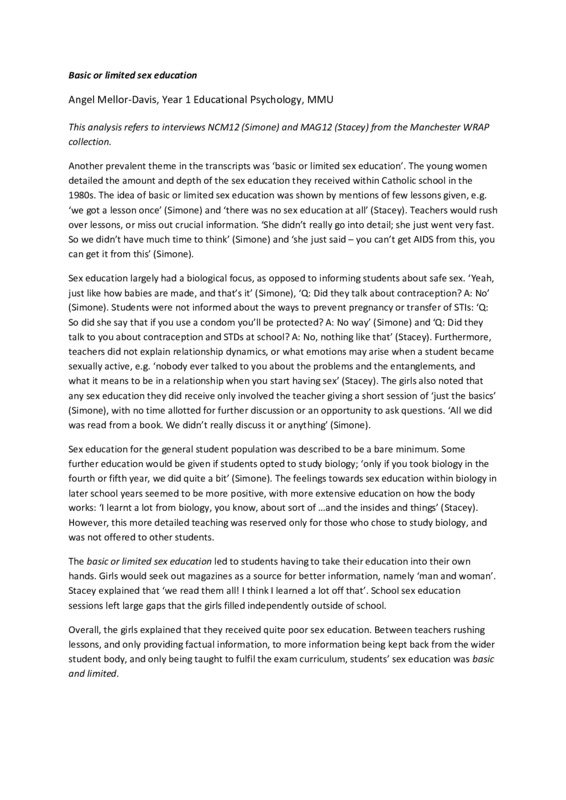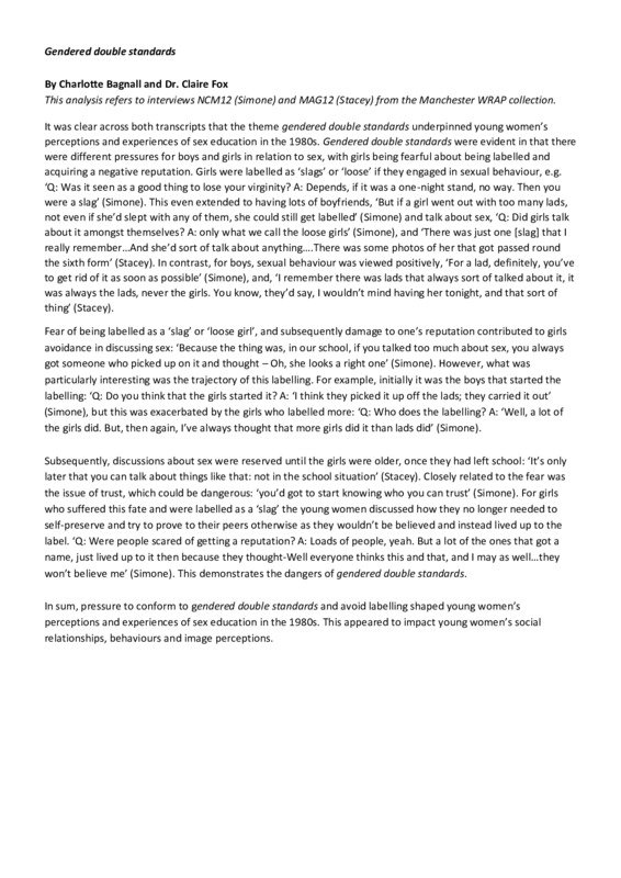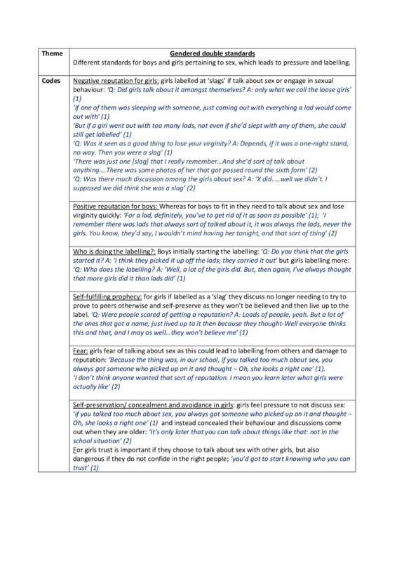 Gendered double standards Different standards for boys and girls pertaining to sex, which leads to pressure and labelling. Codes Negative reputation for girls: girls labelled at ‘slags’ if talk about sex or engage in sexual behaviour: ‘Q: Did girls talk about it amongst themselves? A: only what we call the loose girls’ (1) ’If one of them was sleeping with someone, just coming out with everything a lad would come out with’ (1) ‘But if a girl went out with too many lads, not even if she’d slept with any of them, she could still get labelled’ (1) ‘Q: Was it seen as a good thing to lose your virginity? A: Depends, if it was a one-night stand, no way. Then you were a slag’ (1) ‘There was just one [slag] that I really remember…And she’d sort of talk about anything….There was some photos of her that got passed round the sixth form’ (2) ‘Q: Was there much discussion among the girls about sex? A: ‘X did…..well we didn’t. I supposed we did think she was a slag’ (2) Positive reputation for boys: Whereas for boys to fit in they need to talk about sex and lose virginity quickly: ‘For a lad, definitely, you’ve to get rid of it as soon as possible’ (1); ‘I remember there was lads that always sort of talked about it, it was always the lads, never the girls. You know, they’d say, I wouldn’t mind having her tonight, and that sort of thing’ (2) Who is doing the labelling?: Boys initially starting the labelling: ‘Q: Do you think that the girls started it? A: ‘I think they picked it up off the lads; they carried it out’ but girls labelling more: ‘Q: Who does the labelling? A: ‘Well, a lot of the girls did. But, then again, I’ve always thought that more girls did it than lads did’ (1) Self-fulfilling prophecy: for girls if labelled as a ‘slag’ they discuss no longer needing to try to prove to peers otherwise and self-preserve as they won’t be believed and then live up to the label. ‘Q: Were people scared of getting a reputation? A: Loads of people, yeah. But a lot of the ones that got a name, just lived up to it then because they thought-Well everyone thinks this and that, and I may as well…they won’t believe me’ (1) Fear: girls fear of talking about sex as this could lead to labelling from others and damage to reputation: ‘Because the thing was, in our school, if you talked too much about sex, you always got someone who picked up on it and thought – Oh, she looks a right one’ (1). ‘I don’t think anyone wanted that sort of reputation. I mean you learn later what girls were actually like’ (2) Self-preservation/ concealment and avoidance in girls: girls feel pressure to not discuss sex: ‘if you talked too much about sex, you always got someone who picked up on it and thought – Oh, she looks a right one’ (1) and instead concealed their behaviour and discussions come out when they are older: ‘It’s only later that you can talk about things like that: not in the school situation’ (2) For girls trust is important if they choose to talk about sex with other girls, but also dangerous if they do not confide in the right people; ‘you’d got to start knowing who you can trust’ (1) Teaching qualitative research methods using the reanimation data project archive By Charlotte Bagnall Posted online on 1st April 2020 at: http://reanimatingdata.co.uk/uncategorized/teaching-qualitativeresearch-methods-using-the-reanimation-data-project-archive/ Research methods are a core component of most degree-level programmes, but nonetheless renowned for being students’ least favourite component of their course. Tasked with the role of developing new content to teach qualitative research methods, within the Faculty of Education at Manchester Metropolitan University, I was keen to demonstrate the usefulness and real-world implications of key qualitative methods and analysis to inspire my students. In doing so, I came across the ‘reanimation project’ funded by the Economic and Social Research Council (for more information see: http://reanimatingdata.co.uk/about/), which gave us what we needed and ‘reanimated’ our students. In Week One, students firstly learnt about the importance of archival data-digitising, sharing and reusing data, in addition to ethical considerations to take into account when conducting such work. This led on to Weeks Two and Three, where, following lectures on qualitative data analysis and more specifically Thematic Analysis, the students had the opportunity to conduct their own Thematic Analysis on real-world extracts taken from two interviews collected as part of the Women, Risk & AIDS social research study conducted in Manchester in 1988-90. The students’ research question was ‘What are young women’s perceptions and experiences of sex education in the 1980s?’. From our analysis as tutors, two main themes emerged: Basic or limited sex education and Gendered Double standards. We presented the students with one table for each theme, with the codes and supporting quotes, as well as a short write-up of the theme Gendered double standards as an example. Students were then asked to write up the other theme. Basic or limited sex education was a semantic theme, in other words it described explicit, surface-level meaning within the data. This theme included talk about the basic and limited sex education the young women received within the 1980s. For example, sex education lessons were selective, passive and detached, teachers only focussing on the biological aspects of sex and discussions about emotions and the relational aspects avoided. These gaps were in part shaped by teacher embarrassment and their assumptions of hopelessness, which meant that, as a result, sex education lessons had little impact, students instead having to take their education into their own hands and seek out magazines as a source of better information. In contrast, Gendered double standards is a latent theme and looks beyo