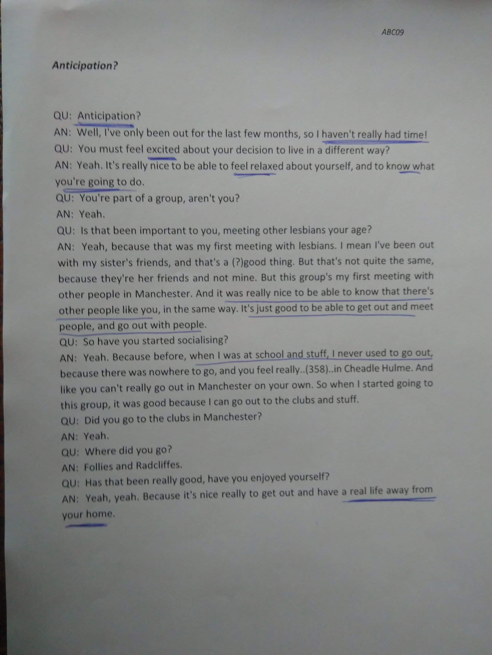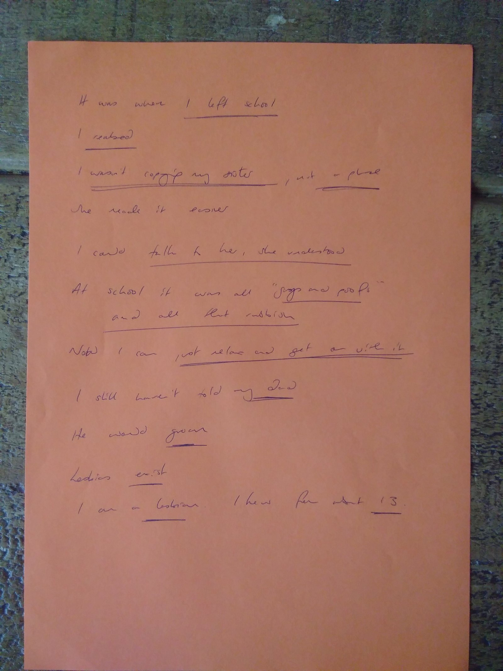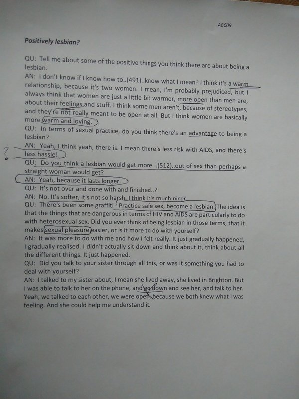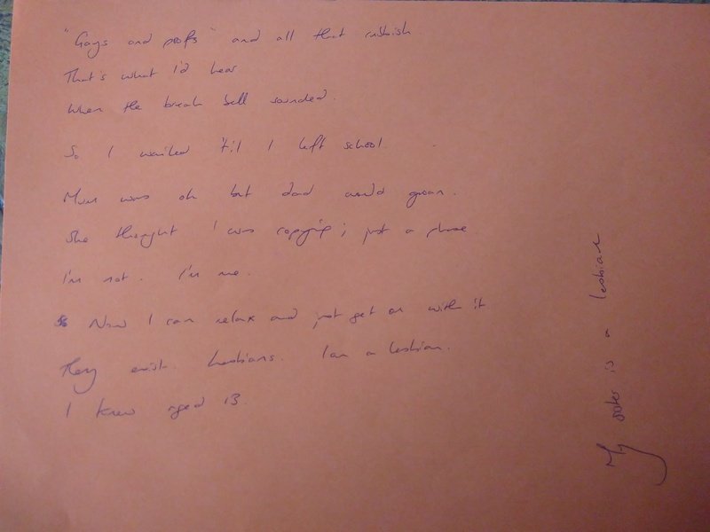 The Reanimating Data Project (2018-2020) involved a series of experiments in working with extracts from interviews with young women from 1989-1990. These poems were created by participants in a workshop at the Sapphormation Festival for women who love women in Manchester on 2 November 2019. By reading and rereading a short extract from a WRAP interview, and paying attention to key themes, words and metaphors, writing a poem can create a condensed and intensified account of the story being told.
