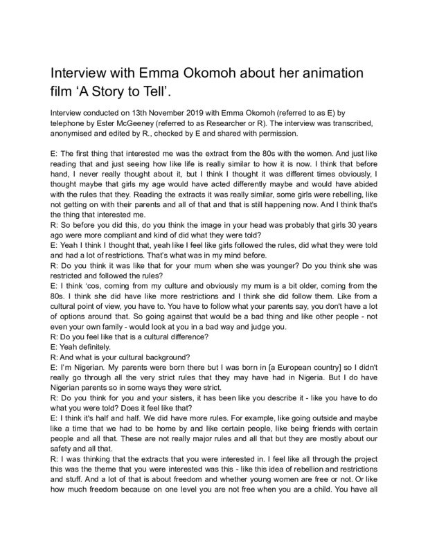 film ‘A Story to Tell’. Interview conducted on 13th November 2019 with Emma Okomoh (referred to as E) by telephone by Ester McGeeney (referred to as Researcher or R). The interview was transcribed, anonymised and edited by R., checked by E and shared with permission. E: The first thing that interested me was the extract from the 80s with the women. And just like reading that and just seeing how like life is really similar to how it is now. I think that before hand, I never really thought about it, but I think I thought it was different times obviously, I thought maybe that girls my age would have acted differently maybe and would have abided with the rules that they. Reading the extracts it was really similar, some girls were rebelling, like not getting on with their parents and all of that and that is still happening now. And I think that's the thing that interested me. R: So before you did this, do you think the image in your head was probably that girls 30 years ago were more compliant and kind of did what they were told? E: Yeah I think I thought that, yeah like I feel like girls followed the rules, did what they were told and had a lot of restrictions. That’s what was in my mind before. R: Do you think it was like that for your mum when she was younger? Do you think she was restricted and followed the rules? E: I think ‘cos, coming from my culture and obviously my mum is a bit older, coming from the 80s. I think she did have like more restrictions and I think she did follow them. Like from a cultural point of view, you have to. You have to follow what your parents say, you don't have a lot of options around that. So going against that would be a bad thing and like other people - not even your own family - would look at you in a bad way and judge you. R: Do you feel like that is a cultural difference? E: Yeah definitely. R: And what is your cultural background? E: I’m Nigerian. My parents were born there but I was born in [a European country] so I didn't really go through all the very strict rules that they may have had in Nigeria. But I do have Nigerian parents so in some ways they were strict. R: Do you think for you and your sisters, it has been like you describe it - like you have to do what you were told? Does it feel like that? E: I think it's half and half. We did have more rules. For example, like going outside and maybe like a time that we had to be home by and like certain people, like being friends with certain people and all that. These are not really major rules and all that but they are mostly about our safety and all that. R: I was thinking that the extracts that you were interested in. I feel like all through the project this was the theme that you were interested was this - like this idea of rebellion and restrictions and stuff. And a lot of that is about freedom and whether young women are free or not. Or like how much freedom because on one level you are not free when you are a child. You have all sorts of restrictions - like legally - on what you can do. But I suppose I was wondering whether that was how it felt to you, like if it felt like that was something you were interested in looking at. E: Yeah. ‘Cos obviously as girls, and not only this time, but also in the 80s. Like, from parents, I don't know, there’s more protection that they want to provide. Because we can be in a vulnerable situation more easier. And kind of the girls role of - people just look at girls differently. That's why we may be restricted of our freedom. We can't do a lot of the things that boys our age group can do. R: And did you feel for you growing up, did you feel less free than other girls from other cultures? E: I don't think I thought about it as being free or freedom but I knew that yes our parents are different and we are brought up differently. We have different values. That's it. I mean I didn't feel like I was kind of kept behind or anything. I just thought it was normal. Yeah we come from different backgrounds, that’s how it is. R: And do you think you've been rebellious? Are you a rebel girl? E: I don't think so. Many of these things that people speak about - I’m not really interested in that. Like doing drugs. The thing in the extracts, there was a girl who did drugs, or smoked weed whatever, people do that now but i'm not really interested. I had friends that did that I was just like standing in the corner, just looking at them. R: ‘Cos I think you were saying in that session on risks that you are not someone who really wants to take risks? E: ‘Cos I think I'm just scared of the consequences of what might happen. Like if I don't know, I don't know the end point. …I'm not saying I don't take any risks, like I just stay in a box. I just do what I know rather than doing something different. R: So the reason why you chose, out of all the extracts and interviews that you looked at, what made you choose the one that you used to make the film? E: I felt like I could relate to that specific extract and maybe other people could as well. Like in that extract I think it was a girl and she was like. I remember that I think she had a lot of siblings and I think she didn't get on with her parents that much and she worked and she was really tired during the week and like weekends she went out and she didn’t have a curfew. All that. I felt like I could relate in a kind of way. R: What was it about that that was relatable? E: The way she spoke. It felt really modern, like the way that people speak now. And I found out that the girl was actually black girl. Yeah I think I was told, after reading it, that she was black after reading it. In my mind I was thinking oh all the girls that were interviewed were like white, white british. It didn't cross my mind that they could be asian, black or other races. I think that's why I chose that extract. R: Is it possible to say why it's important to you to choose a black girl? E: I felt like…It's like representing. Representat