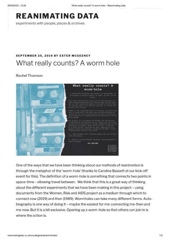 What really counts? A worm hole – Reanimating data REANIMATING DATA experiments with people, places & archives SEPTEMBER 25, 2019 BY ESTER MCGEENEY What really counts? A worm hole Rachel Thomson One of the ways that we have been thinking about our methods of reanimation is through the metaphor of the ‘worm-hole’ (thanks to Caroline Bassett at our kick-off event for this). The definition of a worm-hole is something that connects two points in space-time – allowing travel between. We think that this is a great way of thinking about the different experiments that we have been making in this project – using documents from the Women, Risk and AIDS project as a medium through which to connect now (2019) and then (1989). Wormholes can take many different forms. Autobiography is one way of doing it – maybe the easiest for me: connecting me-then and me-now. But it is a bit exclusive. Opening up a worm-hole so that others can join in is where the action is. reanimatingdata.co.uk/uncategorized/wormholes/ 1/3 29/09/2021, 13:04 What really counts? A worm hole – Reanimating data On October 21st 2019 we showcased one of our worm-hole experiments as part of the Brighton Digital Festival. We shared our work with fragments of original audio recordings in which young men and sociologists talk about sex (collected as part of the Men Risk & AIDS Project). The aim of this experiment was to communicate something of the 30 years of time encompassed by the project – a period characterised by a revolution in technology alongside spectacular yet elusive changes in sexual culture and values. The question of ‘what really counts’ focuses attention on number and marking time – including a sensitivity to timing in making a relationship; how the passage of time makes things look different; and the struggle over time that underpins an attention economy. I n creating this worm-hole we have layered and combined different practical strategies for connecting moments. It is a ‘spell’ that brings together heterogeneous materials with focused intention. We have included biographical time (by inviting original interviewers to re-speak and record questions with questions first asked in interviews in 1990). We have included material time (by changing analog into digital and digital into analog), methodological time (counterposing two generations of feminist methodology) and aesthetic time (connecting a 90’s ‘cut and paste’ aesthetic to a contemporary cut and paste political economy). Paradoxically, the intensity of the mash-up creates space – between questions and answers, between contexts and media and between generations. We hope to have forged a worm-hole that is inviting, inclusive and collective. At the showcase we invited people to view our installation and talk with collaborators Rachel Thomson, Alex Peverett and Janet Holland. A recording of the installation can be viewed here. What really counts? reanimatingdata.co.uk/uncategorized/wormholes/ 2/3 |