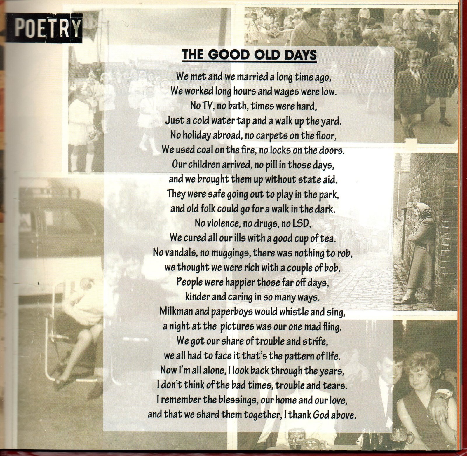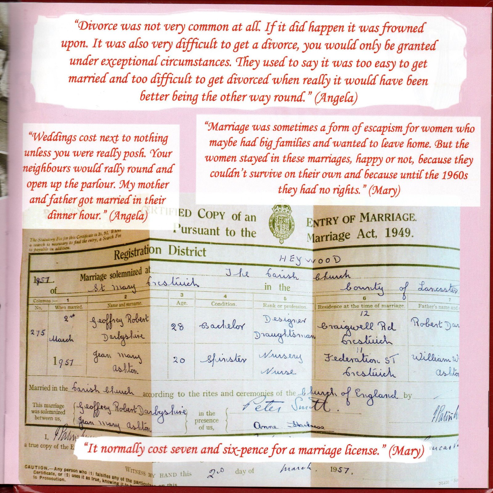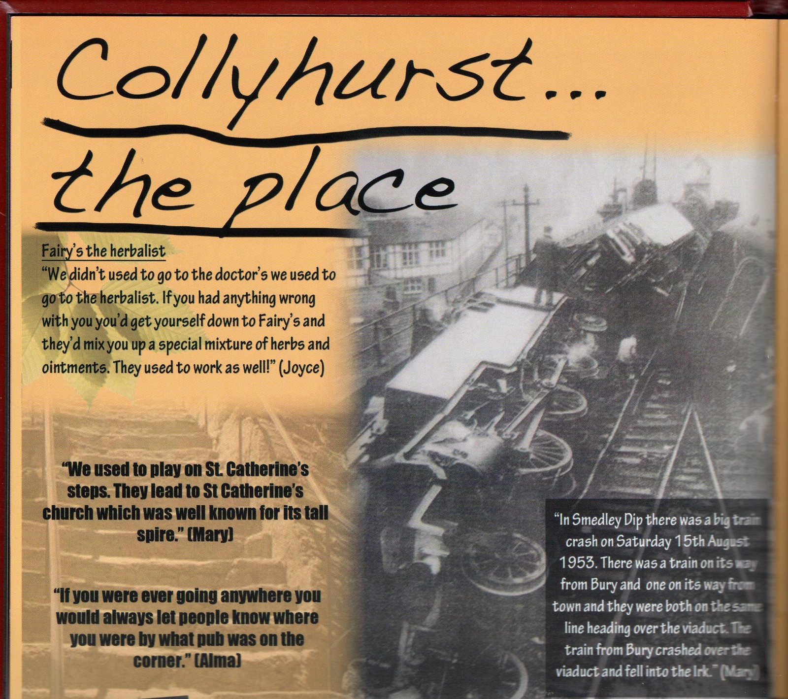 This item includes excerpts from the Once Upon a Time memory book. The book was created using memories of Collyhurst, North Manchester that had been collated by the Once Upon a Time steering group with contributions from local community members. The book includes memories of schooling, war time, religion, entertainment, growing up in poverty, holidays and attitudes toward love and marriage. There are also interactive pages to allow readers to reflect on their own memories. It was published by Manchester Communication Academy and designed by Sophia Huddlestone. The Once Upon a Time (OUAT) project began with the union of two groups: the Manchester Communication Academy and the Irk Valley Tenants and Residents group both based in Collyhurst.