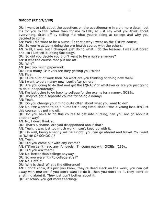 Anonymised transcript of an interview with Lori, who is doing a Pre-health course for nursing, but is not enjoying it too much and would like to be a nanny instead. The Sex Education she received at school was largely biological, where students where split into single-sex groups and read to from a text book, with opportunity for group discussion afterwards. She feels the Sex Education she had was adequate, especially what she had learned through her child-care course with regard to pregnancy. However, there was little on homosexuality, female masturbation and pleasure or relationships (it was typically scientific). Teachers largely relied on leaflets for students to read through. Lori feels AIDS was a taboo, stigmatised topic until she had learnt more about it, but considers those at higher risk to be needle-users and sex workers. She is currently in a relationship and had her first sex with this partner, but had had some sexual experience from previous romantic relationships. Her own sexual pleasure is important to her. She had associated virginity with notions of cleanliness, and was glad that her current partner was also sexually inexperienced, as this meant he was low risk in terms of AIDS or STIs. There was some pressure from peers to lose her virginity. Her and her current partner have discussed marriage, which she is hopeful for in the future. They have not been using contraception, but rather are relying on the 'pull-out' method. Lori has thought about using the pill, but is worried about her mother finding out and about going to the clinic. She feels she is well-informed enough around AIDS to protect herself from any risks.