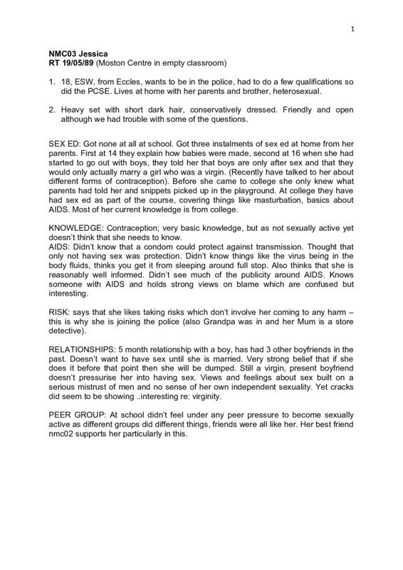 Anonymised transcript of an interview with Jessica, who is at college and working towards a career in the police force. She does not see this as a subversion of traditional gender roles, but would have done twenty years earlier. She received no formal Sex Education at her comprehensive, mixed-sex secondary school, and has relied on 'age-appropriate', largely biological information from her parents. She did not received any formal education on AIDS, and what she does know has been learnt from media campaigns and adverts, which she feels were informative. She originally thought AIDS was reserved for gay men, but has had her homophobia and stigma challenged through PSCE in college. She thinks those at highest risk of AIDS are those who are promiscuous and engage in one-night stands and casual sexual encounters. Jessica had not realised that condoms were an effective method of promoting and practicing safe-sex that protects from transmitting AIDS and other sexually transmitted infections or diseases. Her parents had told her about the pill as a form of contraception. Jessica would like to wait until she is married or in love before having sex, and does not feel she is ready yet, but does acknowledge her right to pleasure within a (hetero)- sexual relationship. She likes the idea of security that might come with marriage. She is in a fairly serious heterosexual relationship at the moment with a 22 year old from Scotland, who has not pressured her into having sex. She does not feel there is any pressure from her peers either, as many of them are still virgins, too, but doesn't think she would succumb to pressure either.