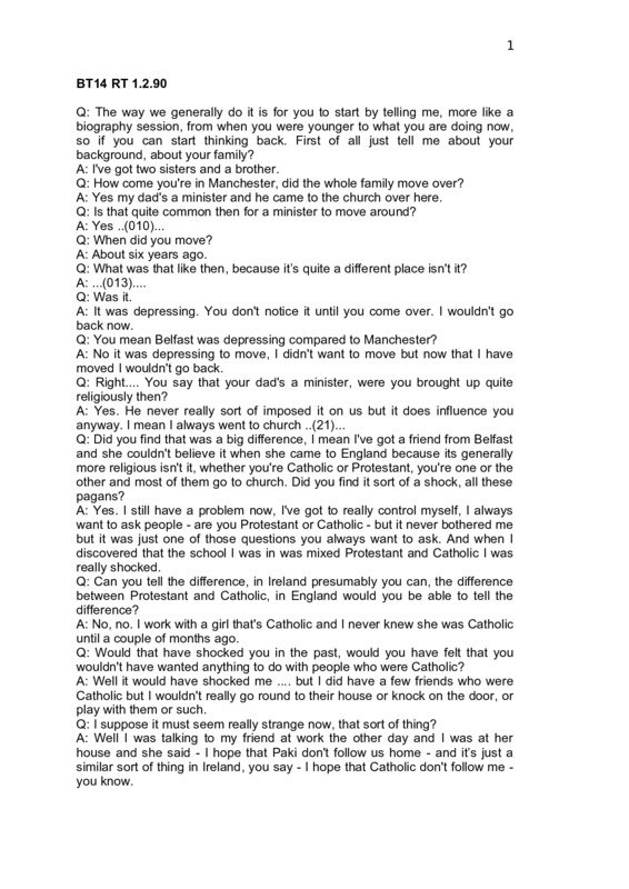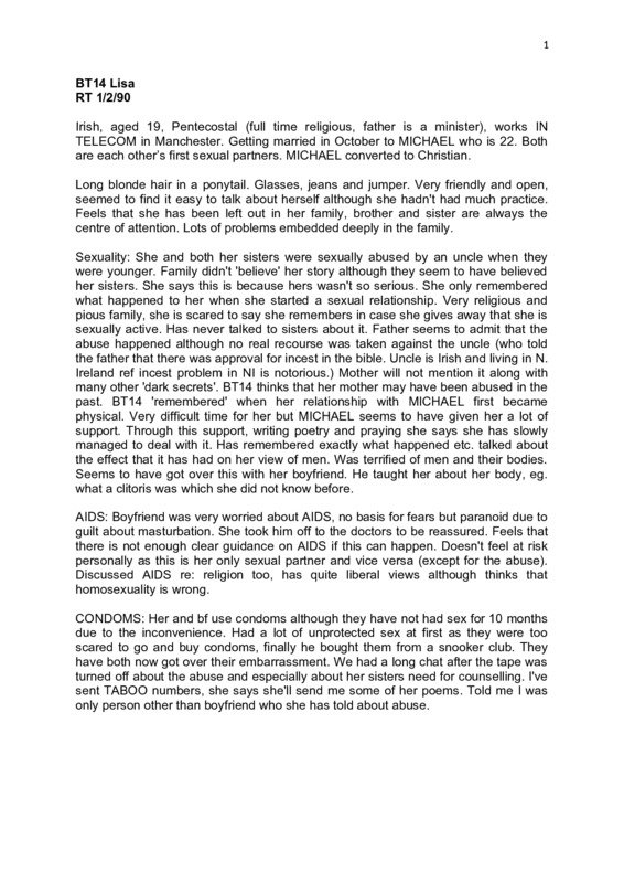 Anonymised transcript of an interview with Lisa, who had moved from Belfast to Manchester. She has had a religious, Catholic (Protestant) upbringing, and her dad is a minister. Lisa had a good, open relationship with her dad, but struggles to connect with her mum. She enjoys her church community, and though she holds Catholic views she has quite a liberal attitude towards her religion, especially regarding sexuality and marriage, though she can find her religion restrictive at times. She was sexually abused by an uncle when she was younger, which has impacted her views and confidence around her sexuality and she feels some shame around, but she is currently in a very supportive and understanding relationship. Lisa had had sexual intercourse with her current partner and they now used condoms, but had been too embarrassed to purchase them in the early stages of their sexual relationship.She does not want to take the pill, as she is worried about the effect it may have on her moods and health. There was lots of pressure at school to not be a virgin, but Lisa feels she gained respect, especially from her male peers, for upholding her religious values around virginity. Female sexual pleasure was acknowledged among her peers, but not understood in practice - it was not part of their sex education curriculum, and she learnt about pleasure through her current partner, who had been told my his father. She did not have any sex education while in Northern Ireland, but has had what she believes is good sex education at her secondary school in Manchester, covering pregnancy, conception and contraception - her (male) teacher was a bit nervous, but was happy to answer and questions students may have had. AIDS was not covered in her formal sex education, and she learnt about it through friends and public health campaigns in the media. She feels fairly informed about AIDS transmission, and thinks it is important for young people to learn about the risks and would still like more, consistent information. She feels that those who are at highest risks of contracting AIDS are 'People like prostitutes or people like that and people who sleep around a lot and don't use condoms'.