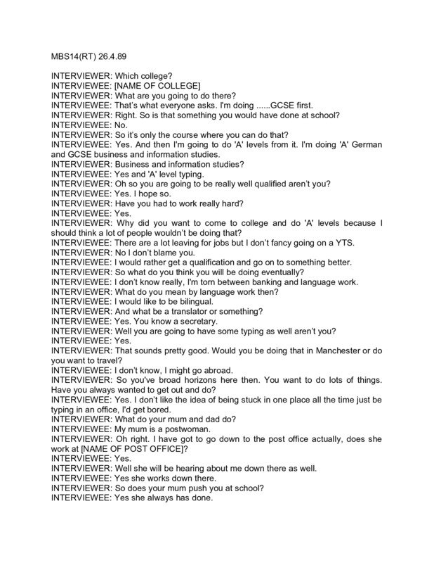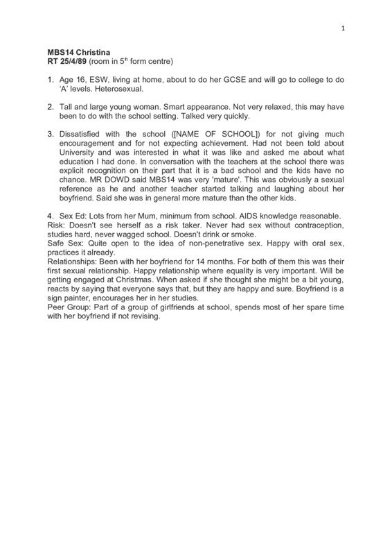 Interview with Christina, 16, White British, working class. Women, Risk and AIDS Project, Manchester, 1989. Anonymised version including fieldnotes (Ref: MBS14)