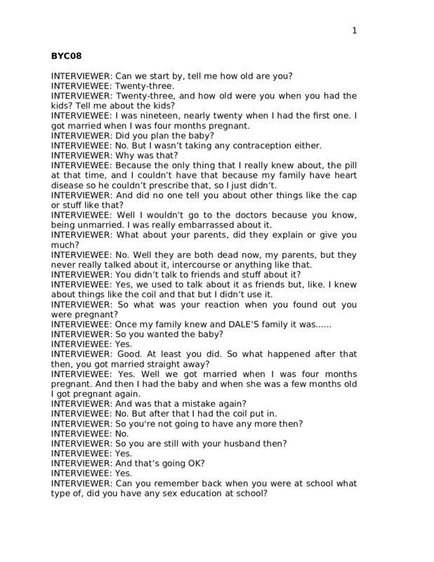 Anonymised transcript of an interview with Jane, 23, who has two children and works part-time in a pub. Her first pregnancy was unplanned, but she had not been using contraception, either. She had her first child when she was 19. She only really knew about the pill, which she couldn't take due to a history of heart disease in her family. Jane had heard about contraceptive devices like the cap, but was too embarrassed to go to her doctor due to (religious) stigma around sex before marriage - she had planned on staying a virgin until she was married. She is now using the coil. Jane went to a Catholic school, and has a pro-life attitude towards abortion, so had not considered it as an option. Her school provided sex education on sexual intercourse and periods. AIDS had been learnt about through TV programmes, and only caused her worry with regard to blood transfusions rather than in the context of a sexual relationship, but does understand AIDS protection through condom use. She thinks those at risk are those who engage in casual sex - she has only had one sexual partner, her husband, and does not plan on having anymore. She learnt about STIs through friends and a youth club.