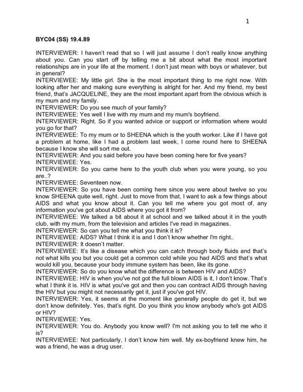 BYC04 (SS) 19.4.89 INTERVIEWER: I haven’t read that so I will just assume I don’t really know anything about you. Can you start off by telling me a bit about what the most important relationships are in your life at the moment. I don’t just mean with boys or whatever, but in general? INTERVIEWEE: My little girl. She is the most important thing to me right now. With looking after her and making sure everything is alright for her. And my friend, my best friend, that’s JACQUELINE, they are the most important apart from the obvious which is my mum and my family. INTERVIEWER: Do you see much of your family? INTERVIEWEE: Yes well I live with my mum and my mum's boyfriend. INTERVIEWER: Right. So if you wanted advice or support or information where would you go for that? INTERVIEWEE: To my mum or to SHEENA which is the youth worker. Like if I have got a problem at home, like I had a problem last week, I come round here to SHEENA because I know she will sort me out. INTERVIEWER: And you said before you have been coming here for five years? INTERVIEWEE: Yes. INTERVIEWER: So you came here to the youth club when you were young, so you are..? INTERVIEWEE: Seventeen now. INTERVIEWER: So you have been coming here since you were about twelve so you know SHEENA quite well, right. Just to move from that, I want to ask a few things about AIDS and what you know about it. Can you tell me where you got most of, any information you've got about AIDS where you got it from? INTERVIEWEE: We talked a bit about it at school and we talked about it in the youth club, with my mum, from the television and articles I've read in magazines. INTERVIEWER: So can you tell me what you think it is? INTERVIEWEE: AIDS? What I think it is and I don’t know whether I'm right.. INTERVIEWER: It doesn’t matter. INTERVIEWEE: It’s like a disease which you can catch through body fluids and that’s not what kills you but you could get a common cold while you had AIDS and that’s what would kill you, because your body immune system has been, like its gone. INTERVIEWER: So do you know what the difference is between HIV and AIDS? INTERVIEWEE: HIV is when you've not got the full blown AIDS is it, I don’t know. That’s what I think it is. HIV is what you've got and then you can contract AIDS through having the HIV but you might not necessarily get it, just if you've got HIV. INTERVIEWER: Yes, it seems at the moment like generally people do get it, but we don’t know definitely. Yes, that’s right. Do you think you know anybody who's got AIDS or HIV? INTERVIEWEE: Yes. INTERVIEWER: You do. Anybody you know well? I'm not asking you to tell me who it is? INTERVIEWEE: Not particularly, I don’t know him well. My ex-boyfriend knew him, he was a friend, he was a drug user. 2 INTERVIEWER: And has he actually got AIDS? INTERVIEWEE: Rumours. Whether he has or not. It wouldn’t surprise me if he did have but. Because he's been doing drugs for like the past ten years. INTERVIEWER: Have you had much contact with people who do drugs generally? INTERVIEWEE: Yes. Not what you call intravenous drug users, not really them, I know a lot of people who like just take 'draw' or something like that. INTERVIEWER: What’s that? INTERVIEWEE: Cannabis. INTERVIEWER: Right, it just that there's lots of different names for it and that’s quite a local name so I was just going to check it out. And we call that dope but you call that draw. Yes. It’s just interesting all the different terms for it. Right, would you see yourself as being at any risk? INTERVIEWEE: No. INTERVIEWER: Can you imagine that you might be ever? INTERVIEWEE: Well I mean it’s like if you sleep with someone you don’t know who that person has slept with and the person they have slept with, slept with. Yes, I suppose I could be but not at the moment. INTERVIEWER: Right. Is it something that you think about at all? INTERVIEWEE: Yes I do. INTERVIEWER: So do you think that you would behave differently in relation to sex now than you would if AIDS didn’t exist? INTERVIEWEE: Well I don’t know because as soon as I started my sexual once encounter its always been AIDS, it’s always been there. Being young it has always been there. INTERVIEWER: That’s right, so you are saying you only had sexual intercourse once and you got pregnant? INTERVIEWEE: Yes. Sad that, isn’t it. INTERVIEWER: It’s a sod. You are not kidding, it’s a sod. You said you didn’t even enjoy it? Is that right? That’s rotten. INTERVIEWEE: No I was seeing him for, he was a very very good friend for three years and then I started going out with him as my boyfriend and we had sex but not sexual intercourse, and I just thought I would get away with it just this once and I was pregnant. I did have sex afterwards once I knew I was pregnant though. You make up for it don’t you. INTERVIEWER: What have you got to lose. And did it get any better? INTERVIEWEE: Yes I suppose so. I can’t slag him that much, it’s cruel. INTERVIEWER: Had you been out with anybody before him? INTERVIEWEE: I was with him when he was my friend, but when I was actually going out with him it was only quite casual so I was seeing other lads at the same time. INTERVIEWER: And would you say you had a sexual relationship with them but didn’t have sexual intercourse, is that what you are saying, or was he the first you had a sexual relationship with? INTERVIEWEE: No. One or two I messed about with but not actually done anything like sexual intercourse. INTERVIEWER: So what, it’s a bit difficult but like messing about, what do you mean? 3 INTERVIEWEE: Well you know, kissing and what can you say. I've slept with lads but not actually.. INTERVIEWER: Just not gone all the way. INTERVIEWEE: Yes, that’s what I mean. INTERVIEWER: And was that your decision that you didn’t want to? INTERVIEWEE: Yes. INTERVIEWER: Tell me why? INTERVIEWEE: Well because he meant a lot to me and I felt like, not like I owed it him, but like well I wanted to 