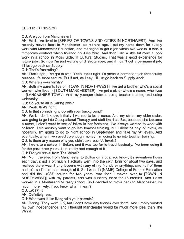 Anonymised transcript of an interview with a young woman (Tina) in her early twenties who works at a school in South Manchester.