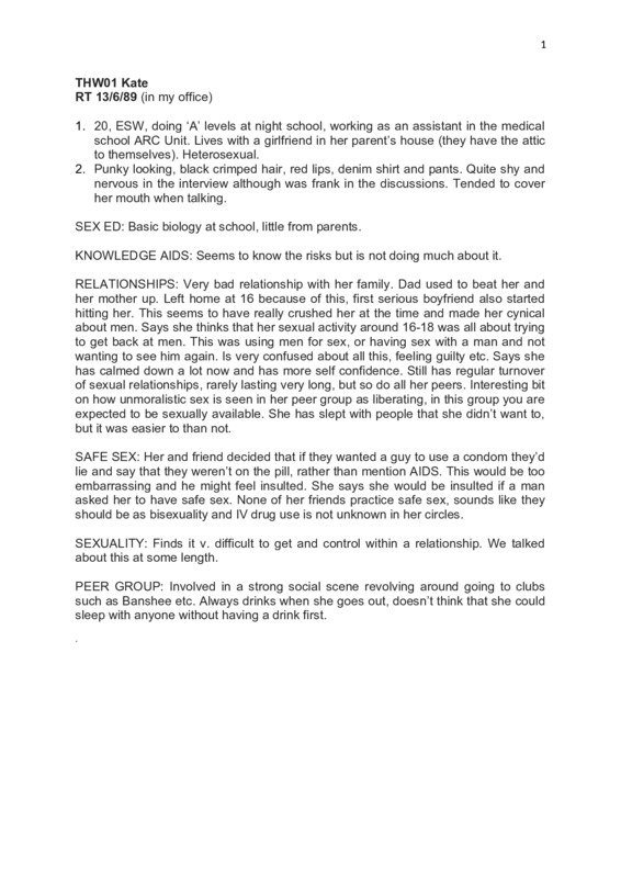 Interview with Kate, 20, White British, working class. Women, Risk and AIDS Project, Manchester, 1989. Anonymised version including fieldnotes (Ref: THW01)