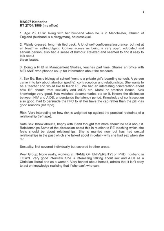 Interview with Katherine, 23, White British, middle class, Protestant. Women, Risk and AIDS Project, Manchester, 1989. Anonymised version including fieldnotes (Ref: MAG07)