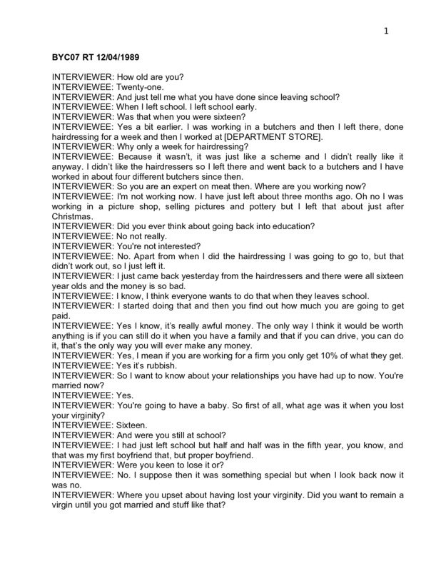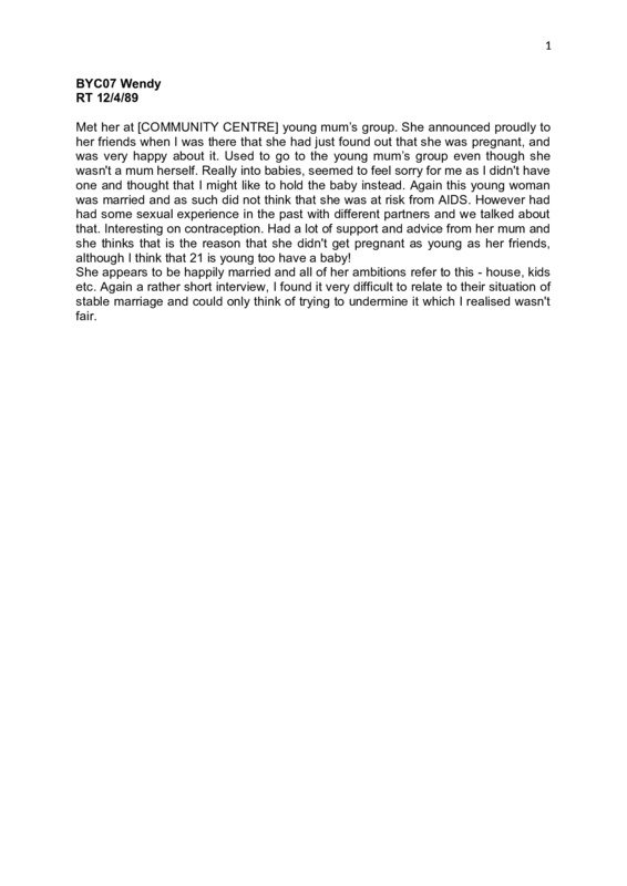 Transcript of an interview with a 21 year old young woman (Wendy) living in North Manchester. Anonymised version.